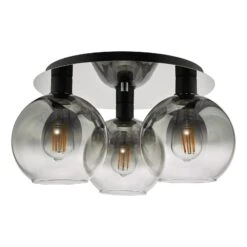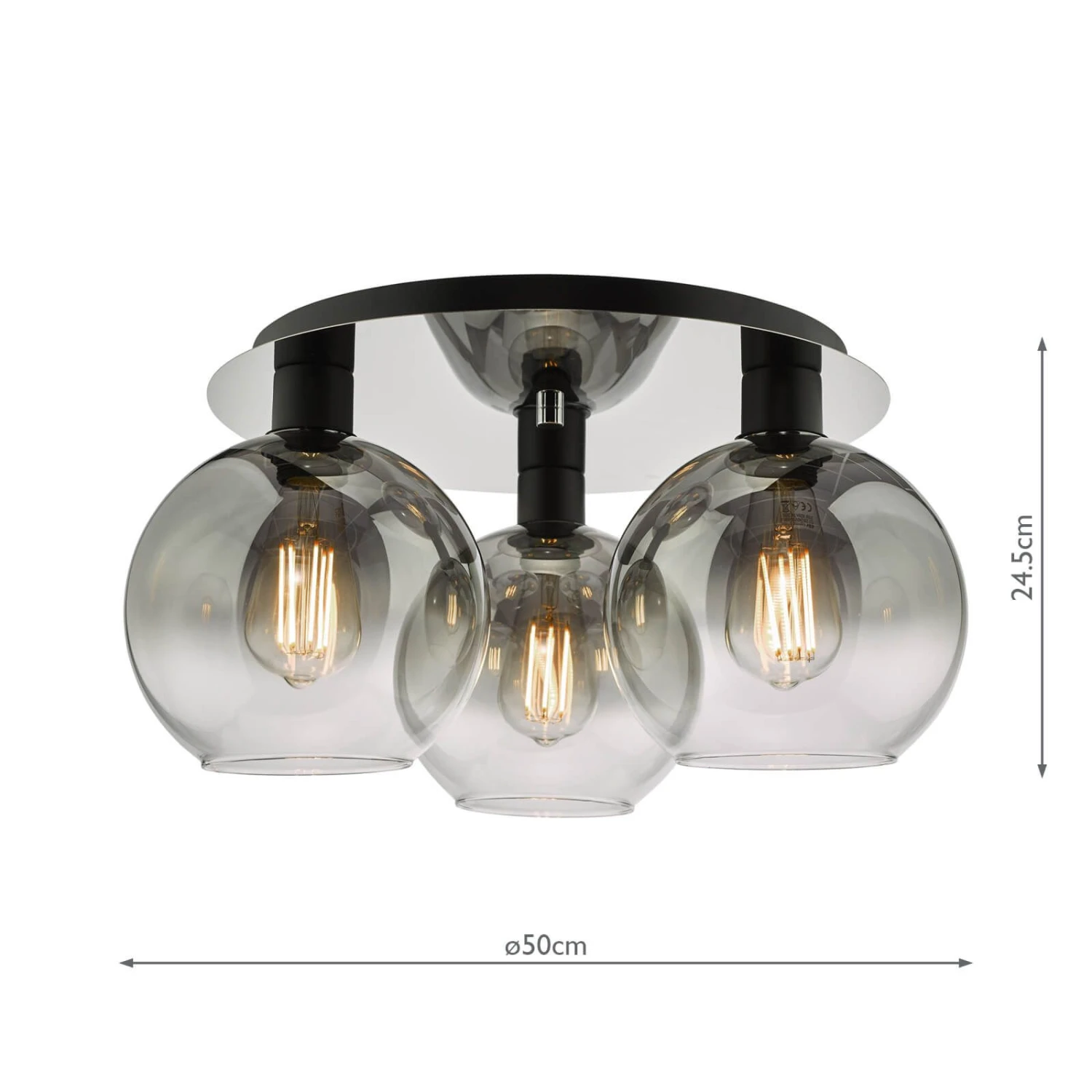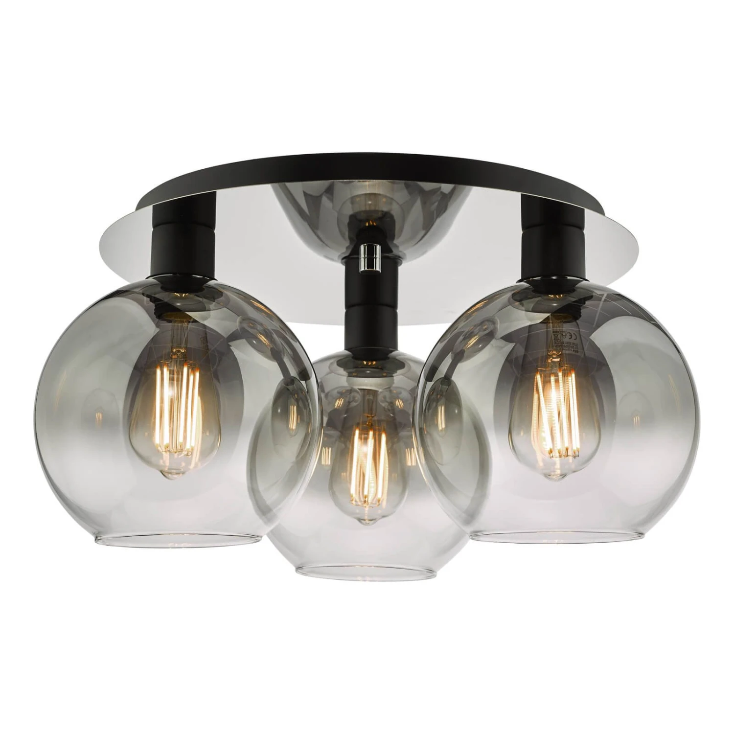 The Lycia 3 light flush ceiling light features large mirrored ombre glass globes able to take a small globe lamp or vintage style LED lamp (sold separately). The ceiling plate features a mirror polished plate with black detailing.
