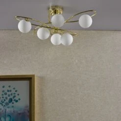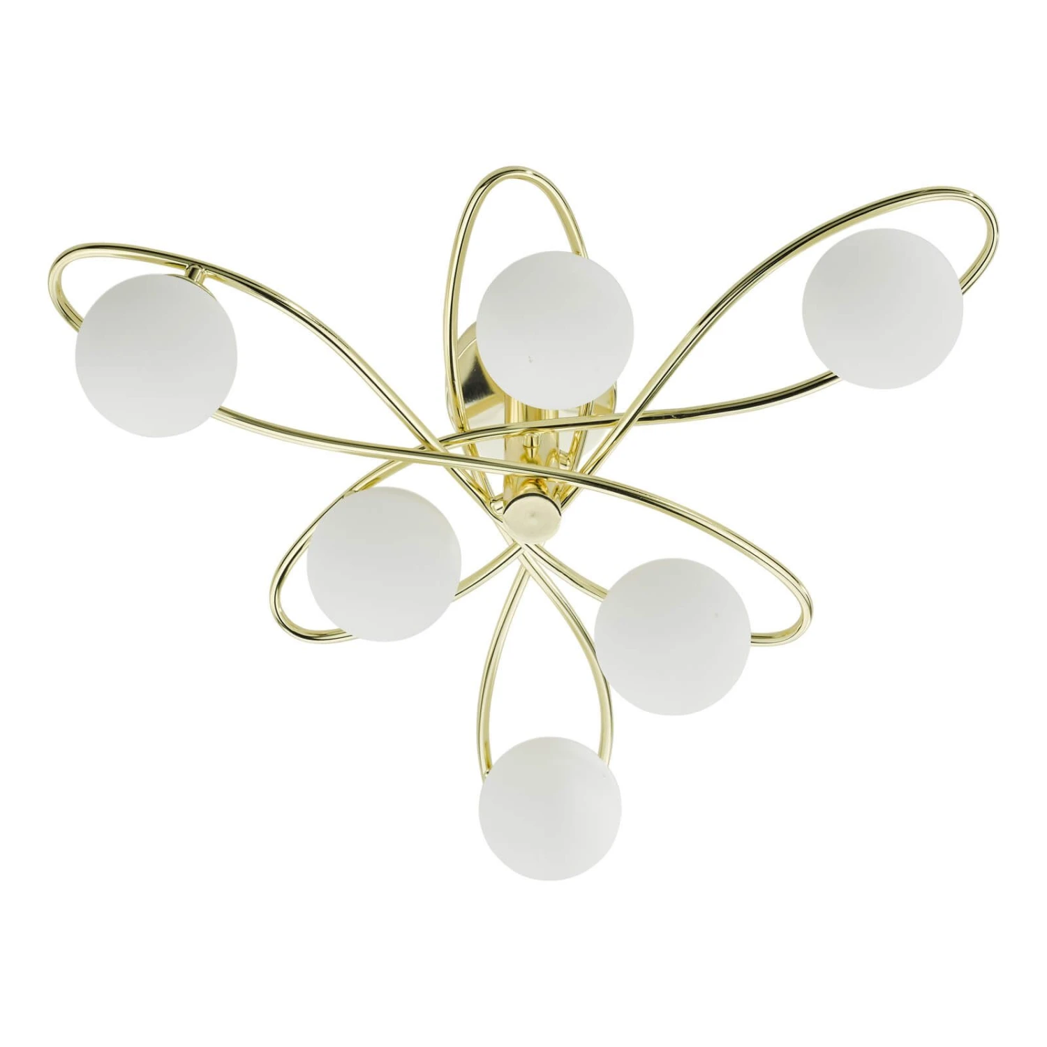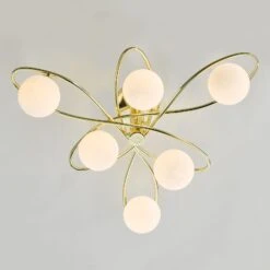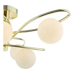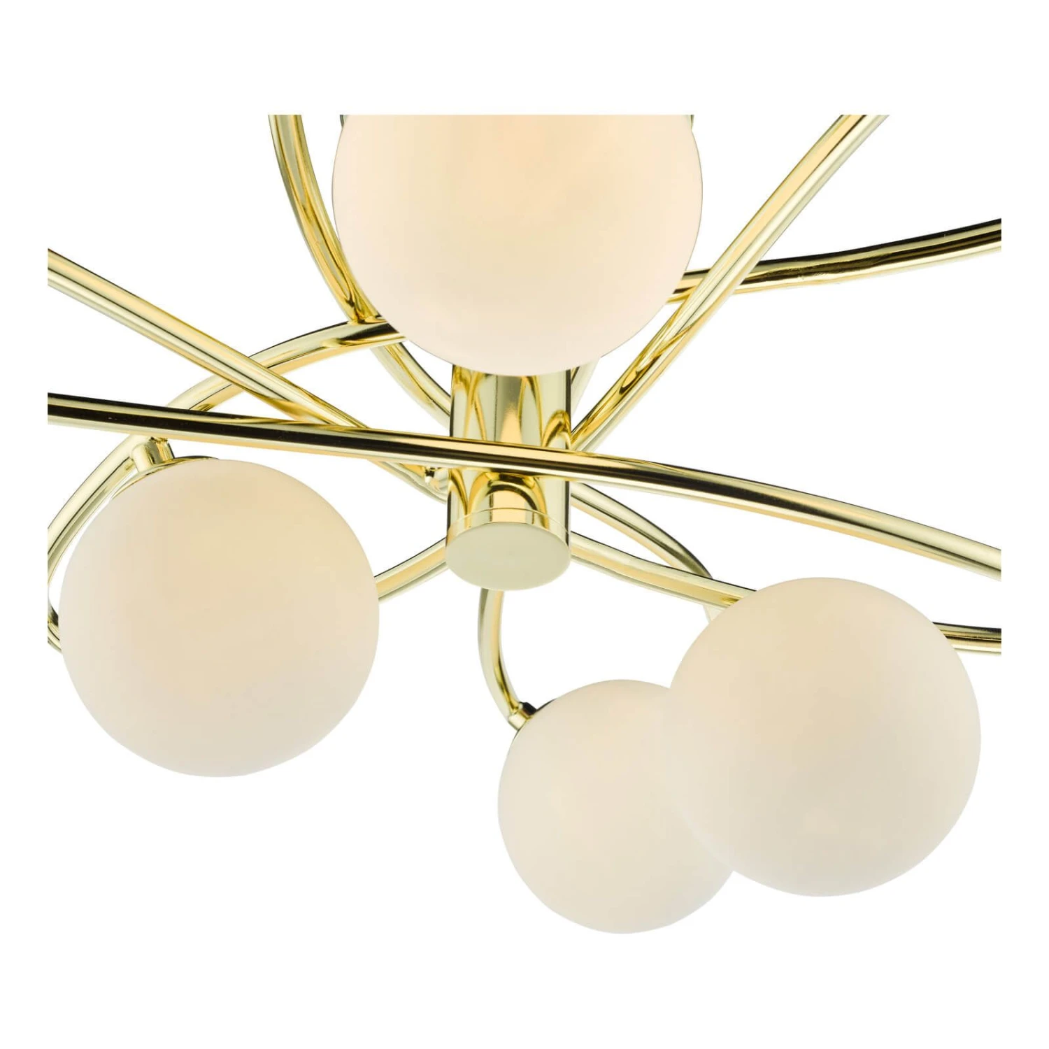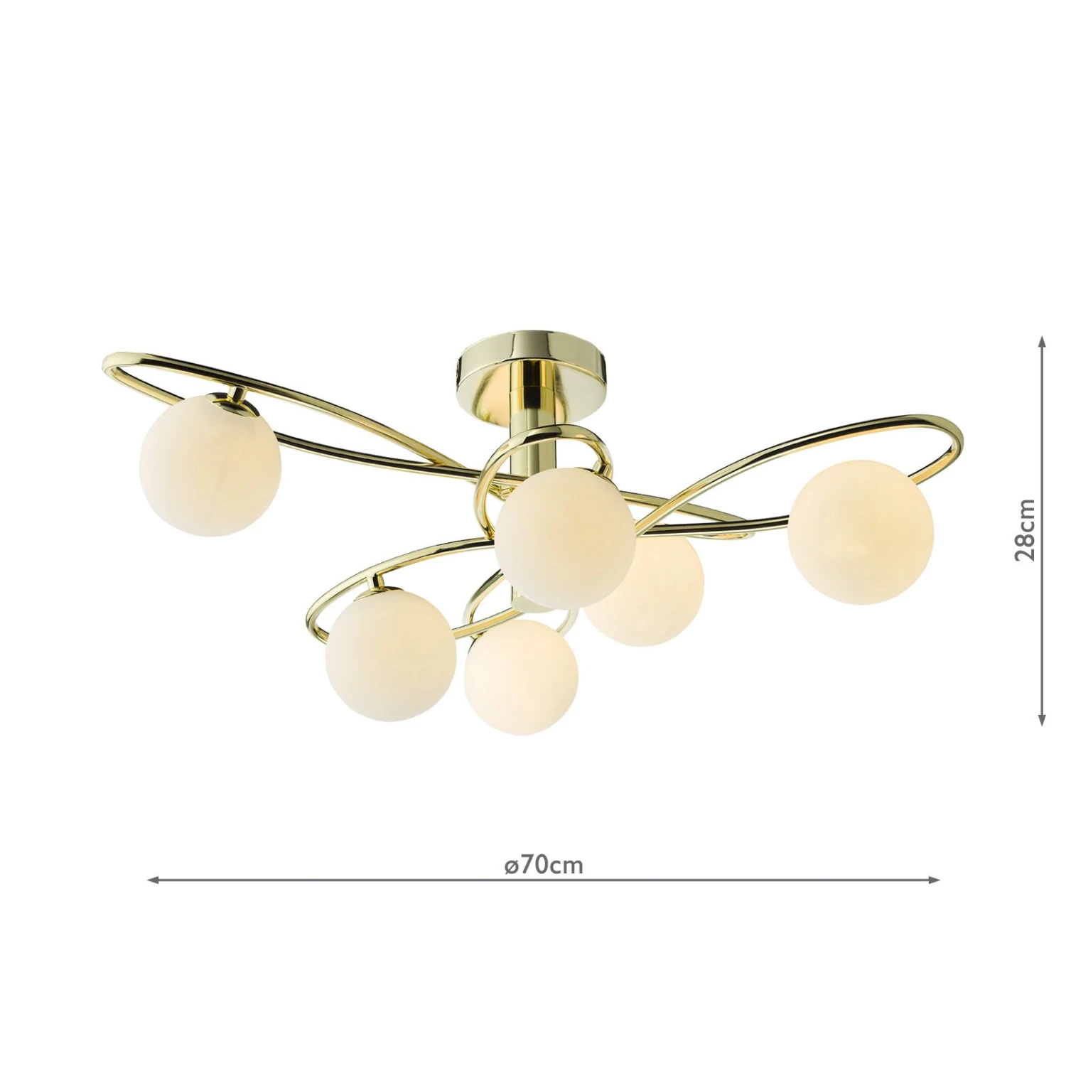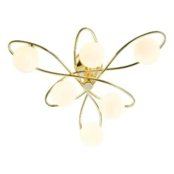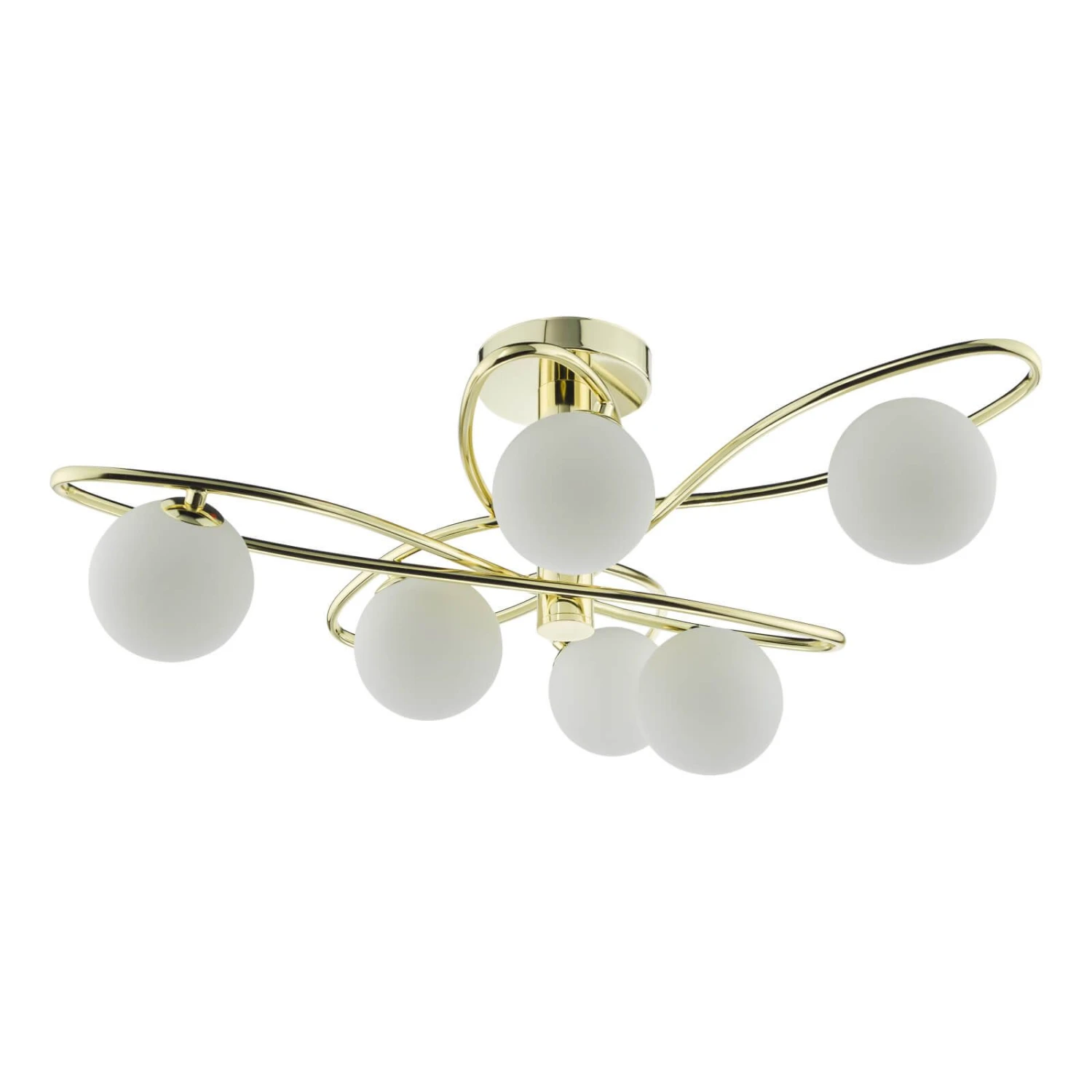 The Lysandra 6 Light Semi-Flush Ceiling Light is a fluid shape semi-flush ceiling lamp with fluid curves of polished gold and opal glass shades. The Lysandra lamp is a semi-flush fitting, suitable for low ceilings. The Lysandra semi-flush is a refined and understated lighting fixture with an air of elegance and style. The Lysandra semi-flush is suitable for an bedroom, dining room, living room or anywhere a little style is needed.