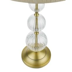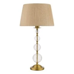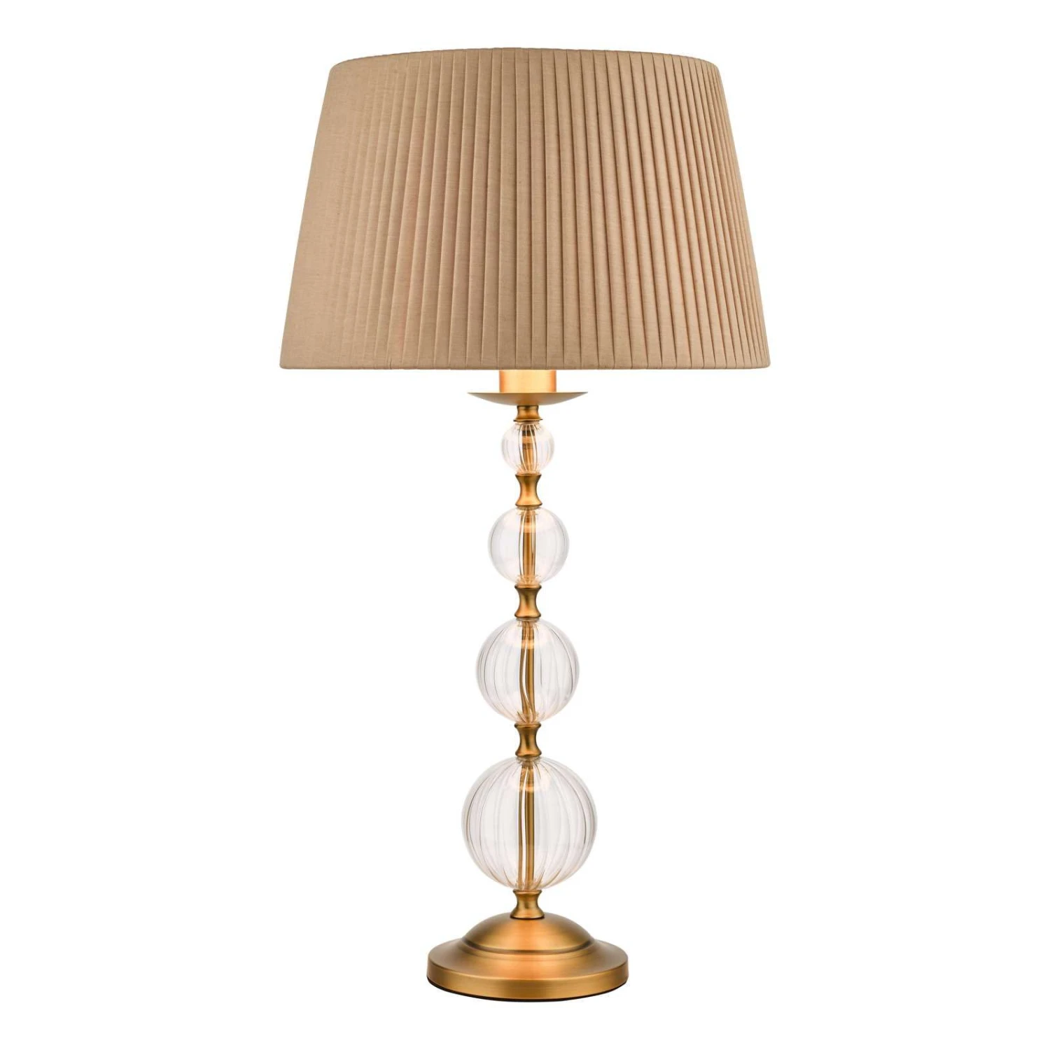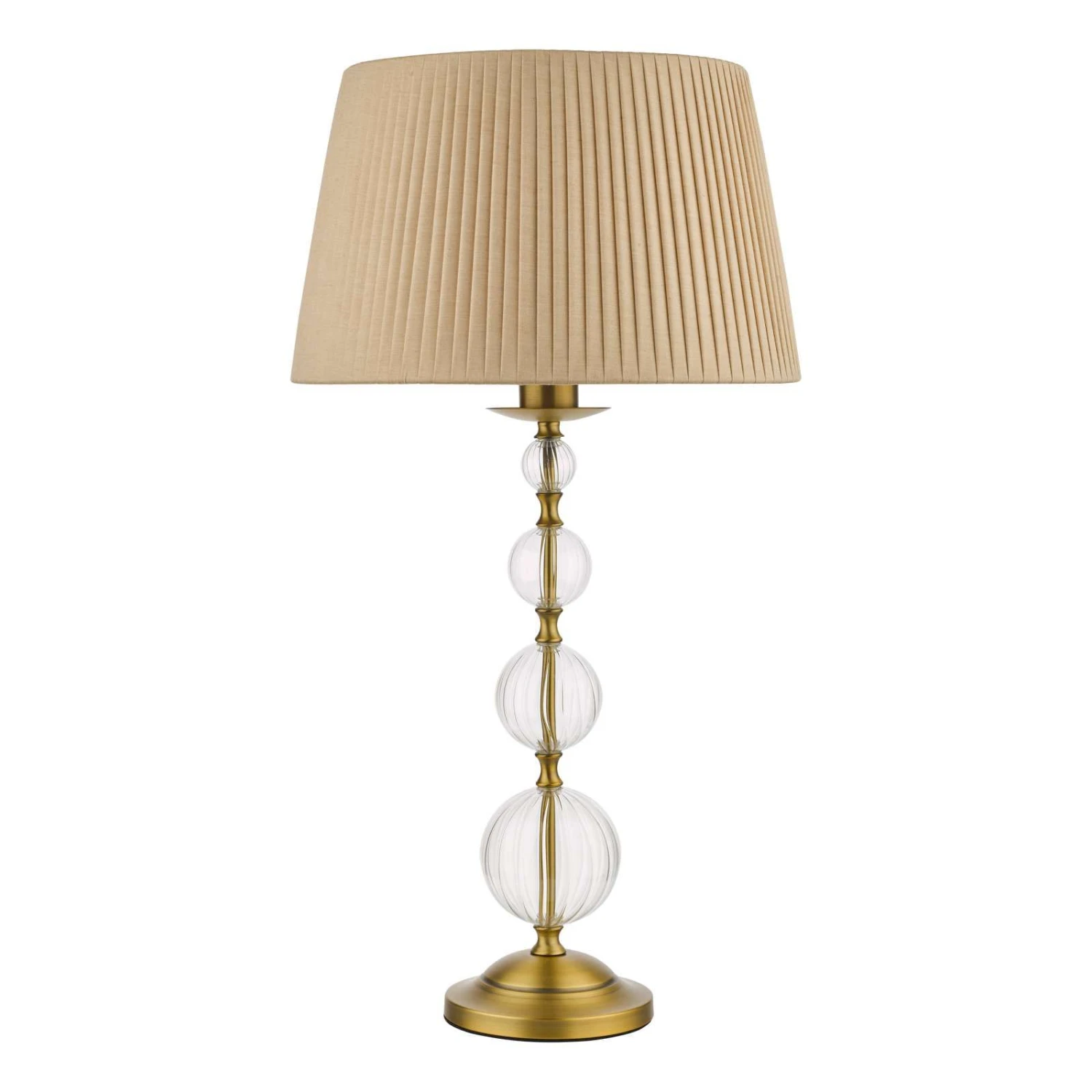 The Lyzette table lamp finished is a contemporary take on a traditional table lamp, featuring modern hand blown waterfall glass on aged brass metal work, finished with a taupe knife pleated shade with matching lining. Fitted with a black fabric braided cable and inline rocker switch.