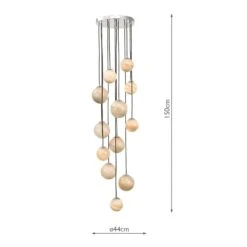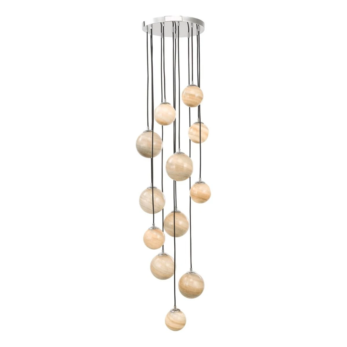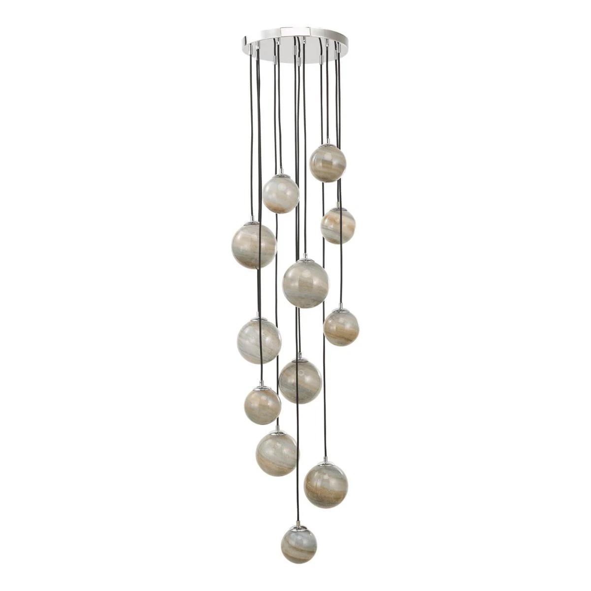 Transform your space with the Mikara 12 Light Cluster Pendant. Hand-blown glass shades inspired by the planets create an enchanting look, each displaying a unique swirl of blue and orange hues, with polished chrome detailing.
