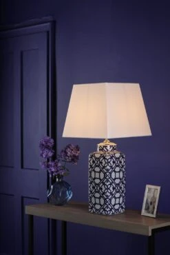 The MYSTIC 1lt Table Lamp features a blue and white geometric pattern, square-shaped ceramic base and is in line rocker switched.