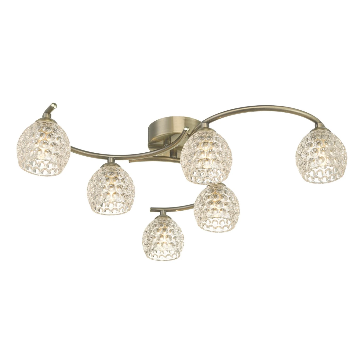 The Nakita 6 light semi flush ceiling light in antique brass and clear glass shades. The heavy glass pressed glass shades of the Nakita semi flush ceiling light have deep circular impressions giving a bubble light appearance that gives an interesting and beautiful lighting effect when on and still glistens in ambient light when off. The antique brass finish is becoming more fashionable in modern interiors but also can look at home in a more traditional setting.