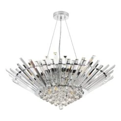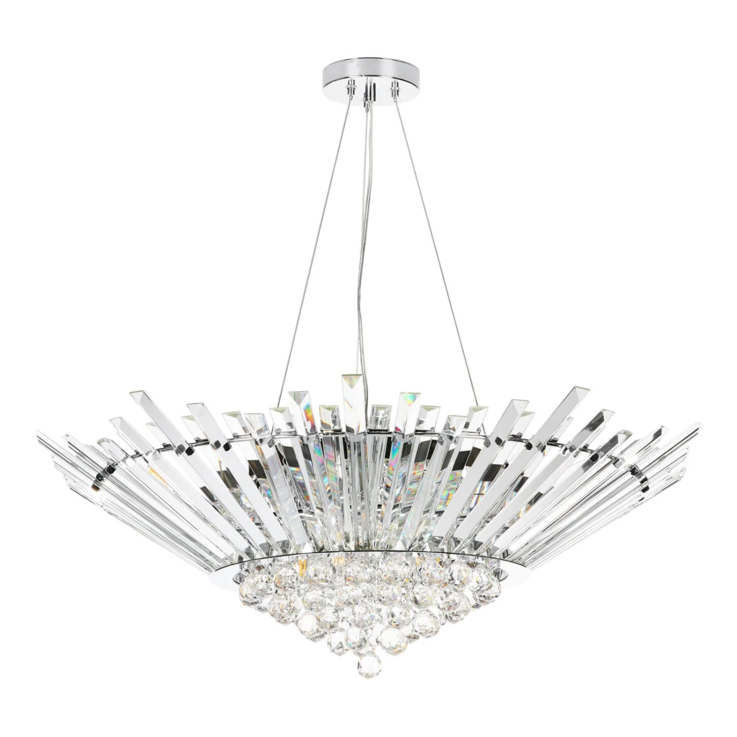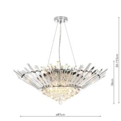 The Nimbus 9 Light Crystal Chandelier is a stunning contemporary crystal chandelier, inspired by a ballerina ring. A starburst of coffin crystal surrounds a centre of faceted crystal drops, the shallow yet impressive fitting is very versatile, hung with steel tension cables, it appears to float in the room and can be adjusted in height to a minimum of 50cm. A statement in any room, perfect in a lounge, grand entrance way or over a dining table or bed.