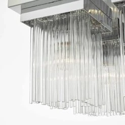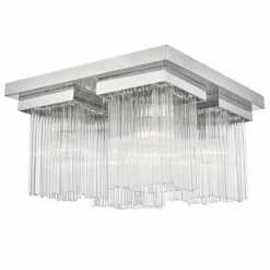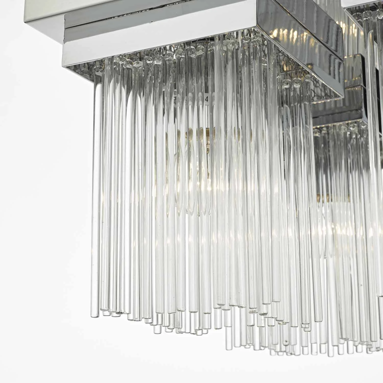 The ODETTE 4 light flush ceiling light is finished in polished chrome with clear glass rods arranged in four individual squares to give a modern take on an old Austrian Jugendstil design. Jugendstil refers to the German Art Nouveau movement.
