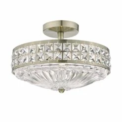 OLONA takes the traditional crystal ceiling flush and updates it with beautiful sparkling square faceted crystal beads mounted in an antique brass frame with a decorative clear glass diffuser. With a generous 3 x e14 lamps this compact flush gives out a great light for its size.