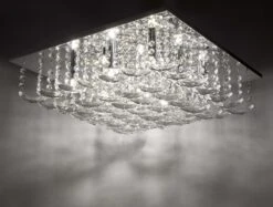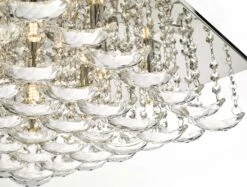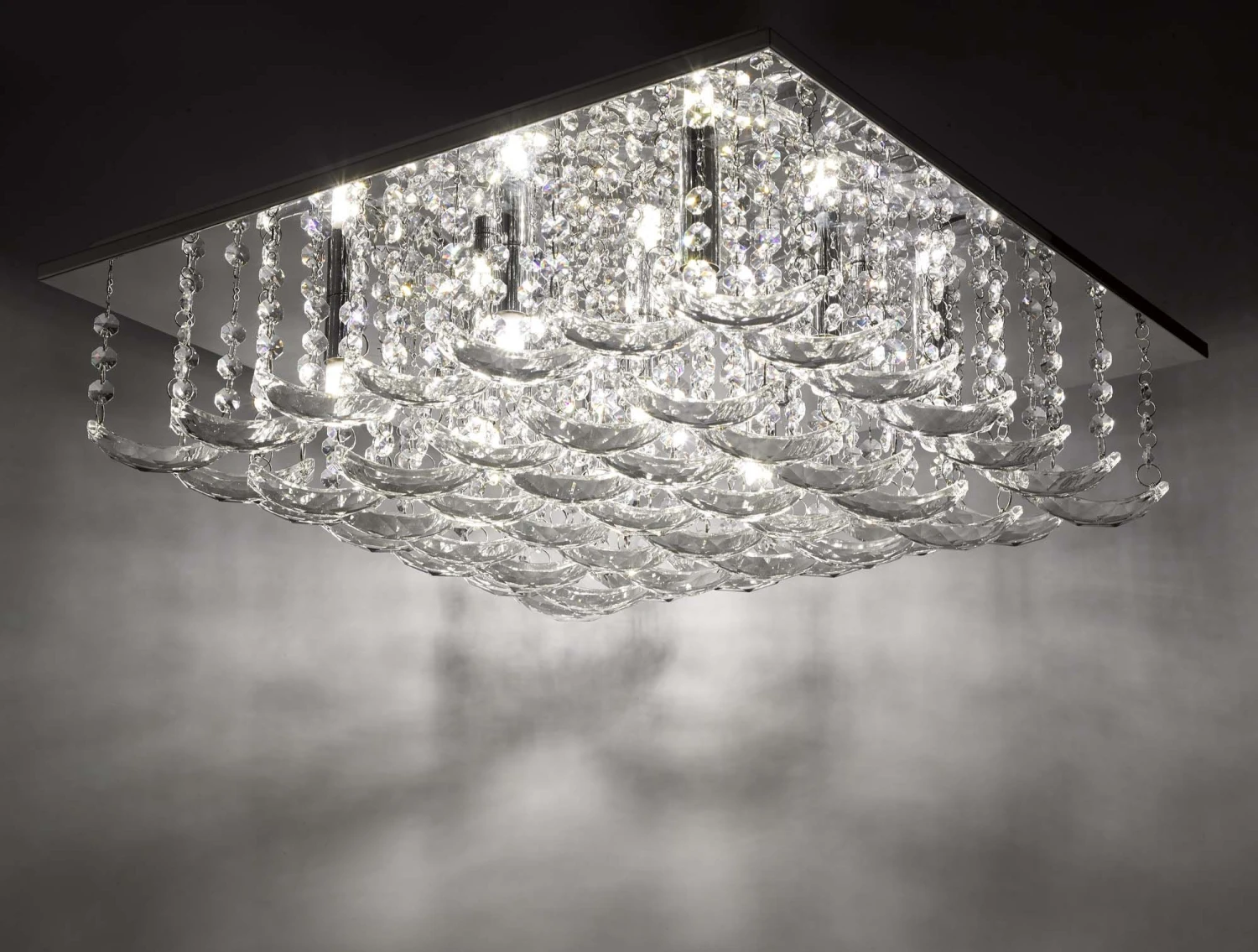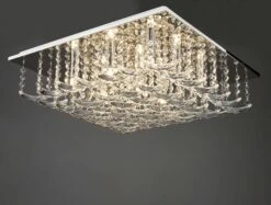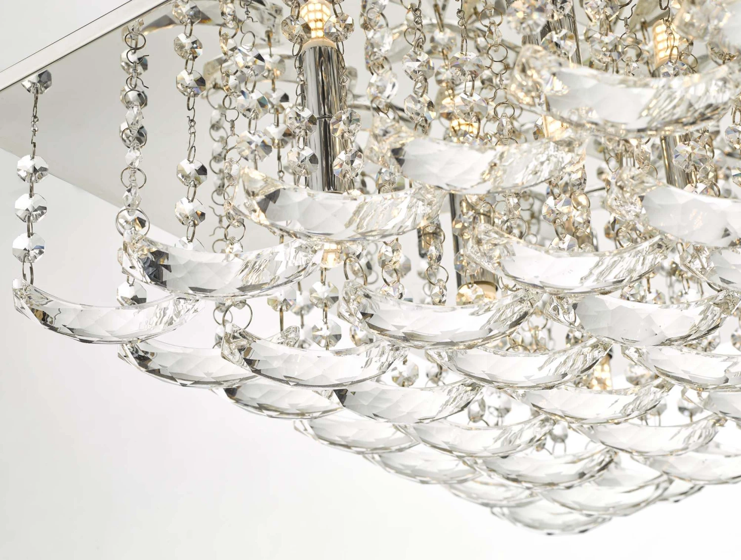 The Orella 9 light Flush ORE1350 is a curved faceted crystal flush fitting suspended in a perfect square giving a stunning lighting effect, finished in polished chrome. Available in a smaller size.