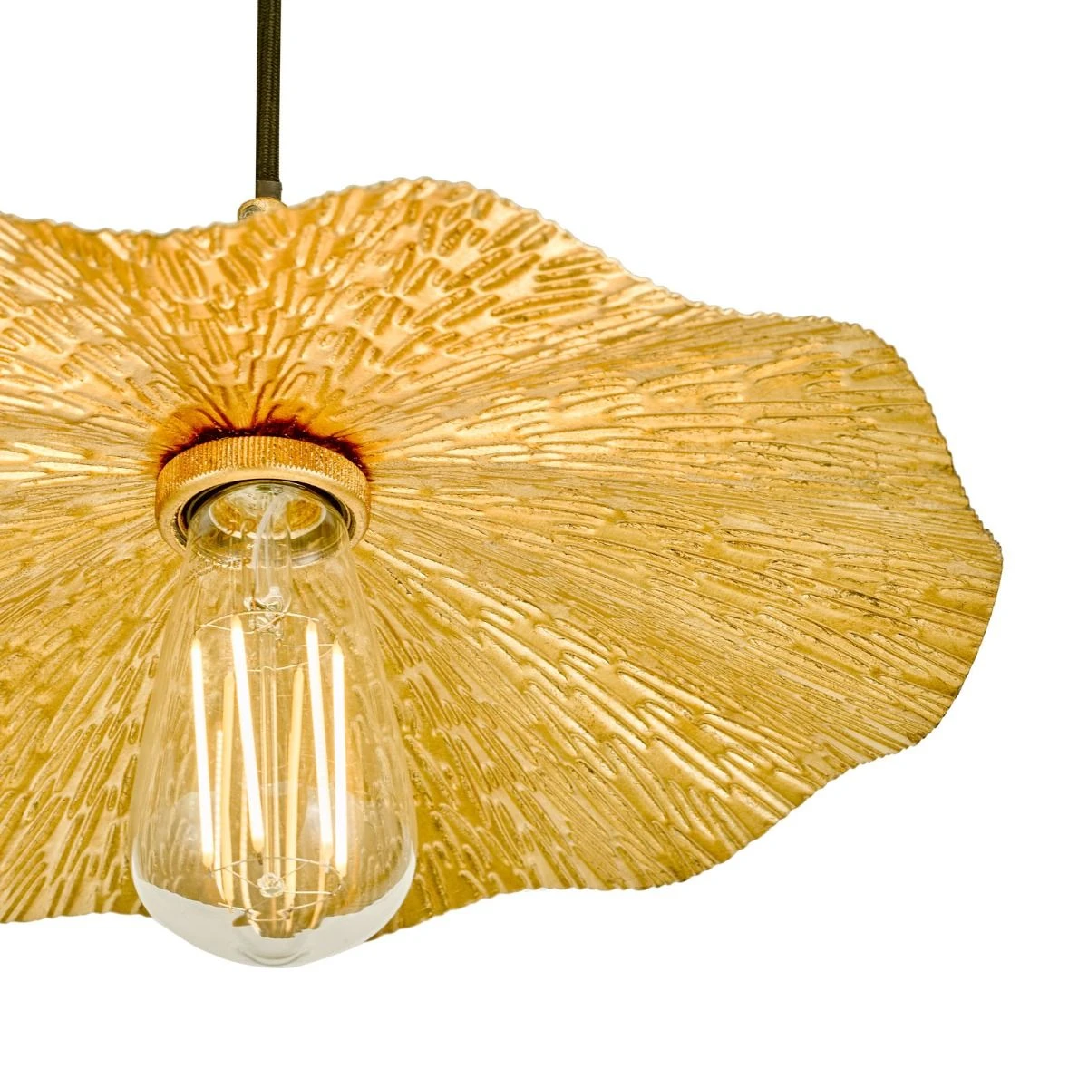 The Piper single pendant light features an undulating textured metal shade, hand finished with gold effect leaf, suspended by 1 metre of black braided cable which can be adjusted on installation.