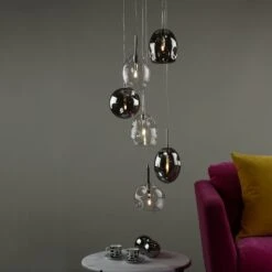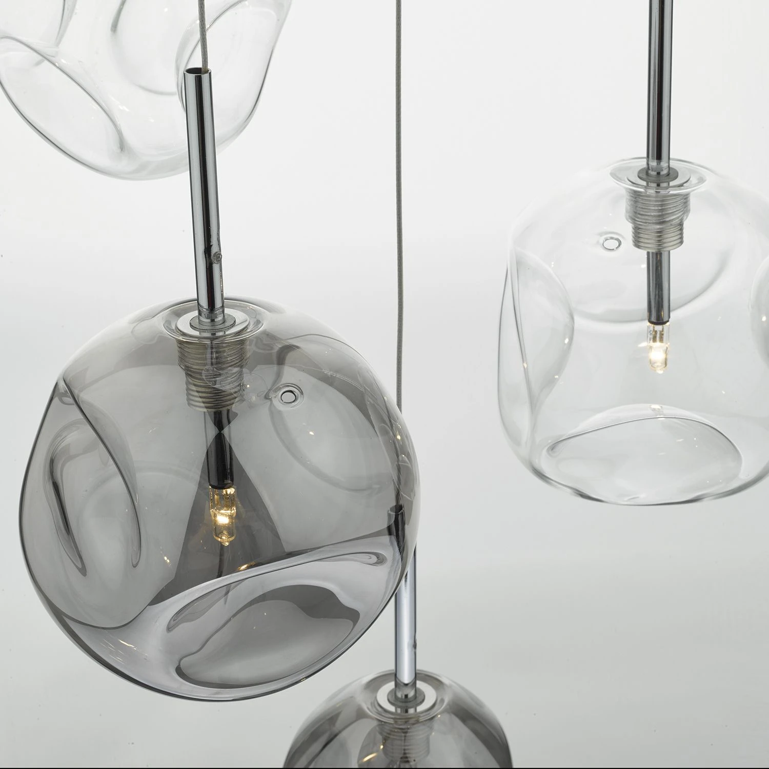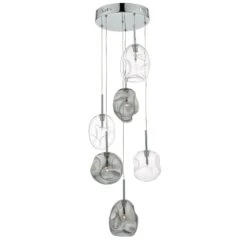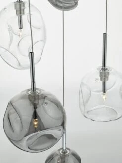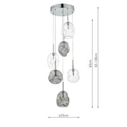 The Quinn six light pendant has organically shaped, mouth-blown glass shades with oversized dimples, in a lightly smoked finish, suspended in a cluster of fixed stems from a fixed ceiling plate. Each glass piece has a unique shape and alternates between clear and lightly smoked glass, and also between spherical and elongated spheres. Paired with bright polished chrome finish metalwork, this is a unique and striking ceiling fitting, suitable for any interior space.