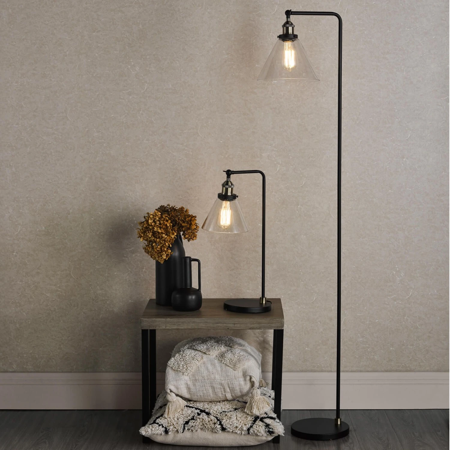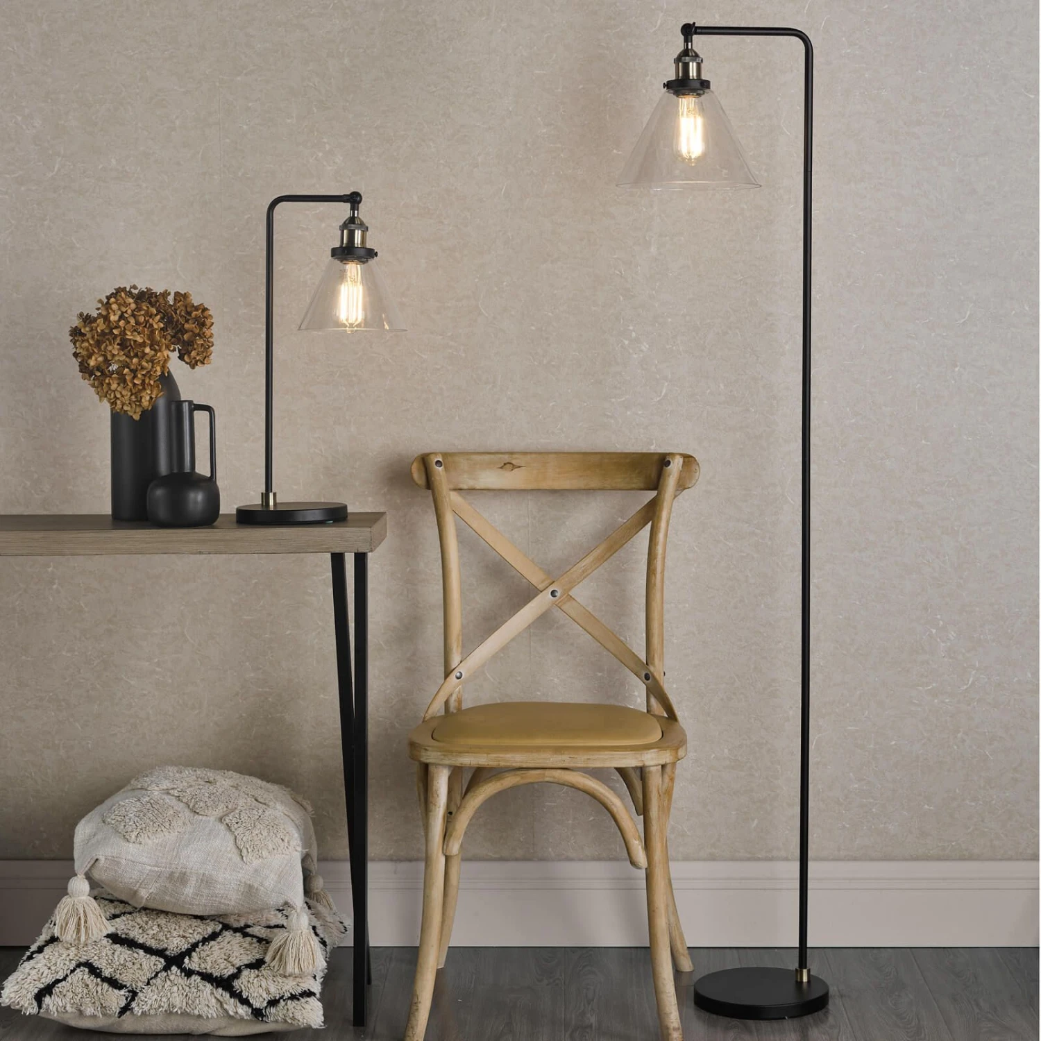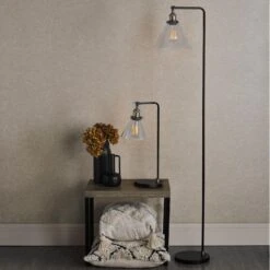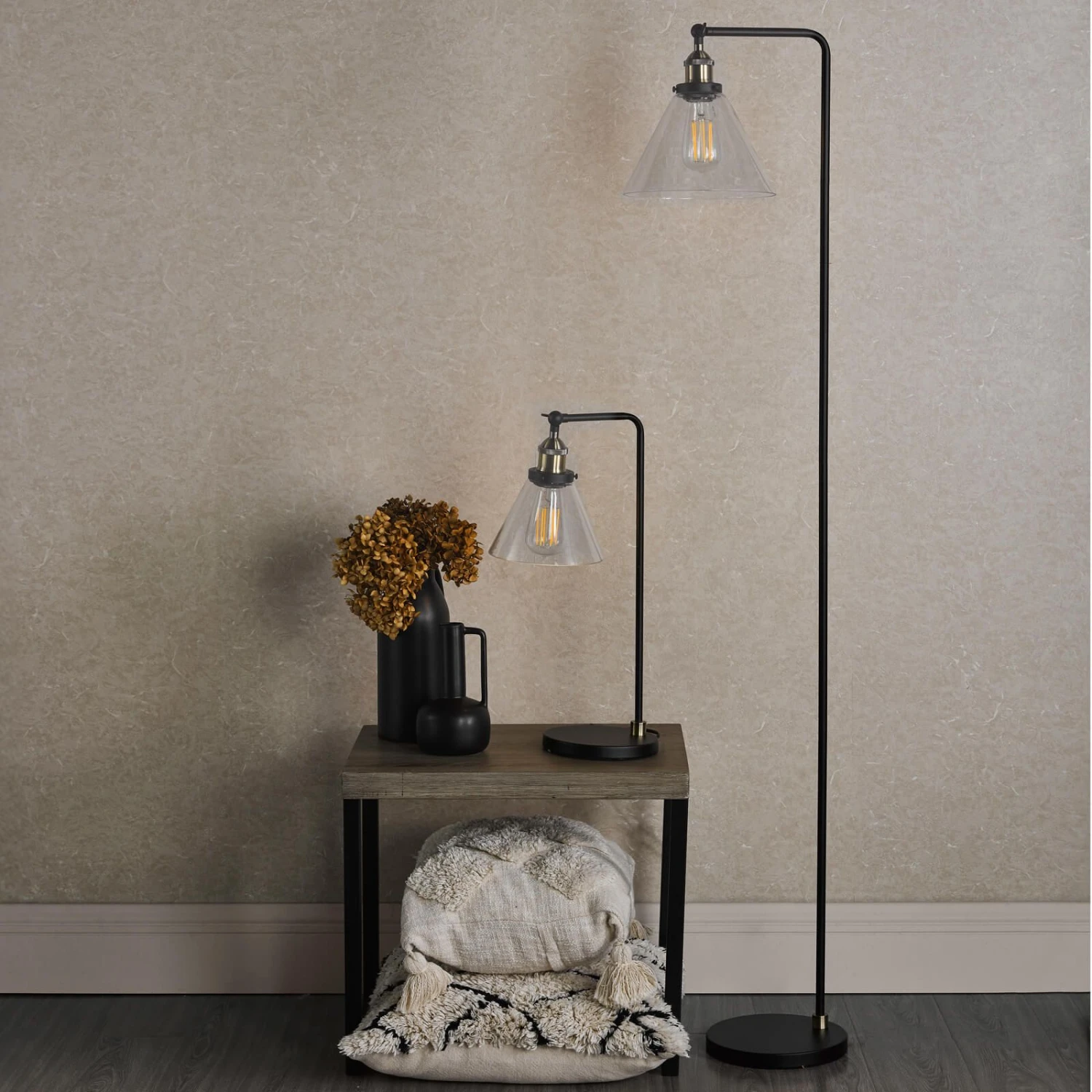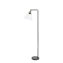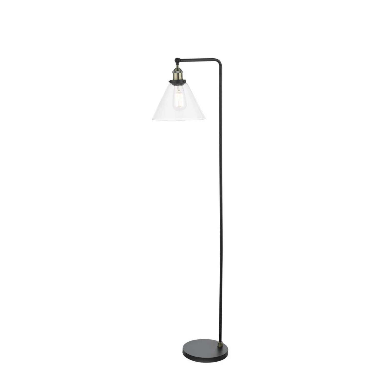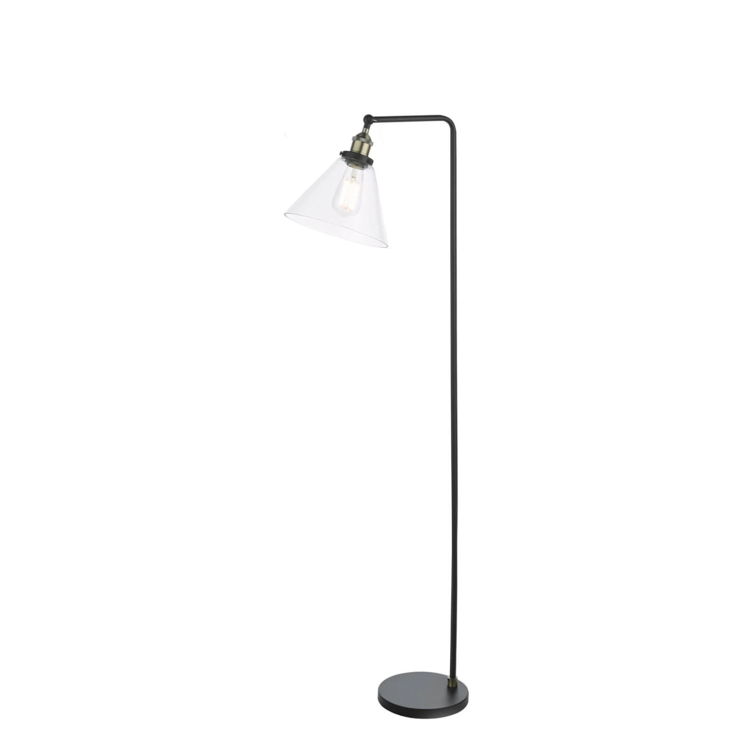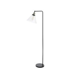 The Ray Floor Lamp brings a refined industrial look to your space. Its matte black frame and antique brass accents are accented by a cone-shaped glass shade. A black braided cable leads to a foot-activated switch, allowing you to illuminate the lamp with ease. Whether you want a focused or ambient light, the Ray floor lamp has you covered. Its adjustable lamp head allow you to direct light exactly where you want it. The Ray floor lamp is ready to illuminate your home. Part of our popular Ray range featuring ceiling lights and a table lamp
