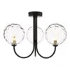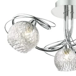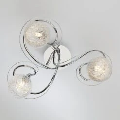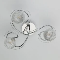 REHAN – is a compact modern style ceiling fitting with 3 x G9 lamp holders set in a delicate clear ripple glass shade with decorative wire inserts to create a beautiful lighting effect. Ideal for low ceilings this light gives out a great sparkle.