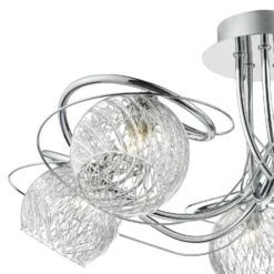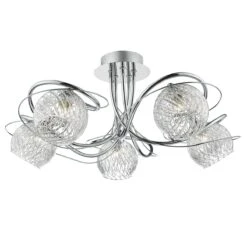 REHAN – is a compact modern style ceiling fitting with 5 x G9 lamp holders set in a delicate clear ripple glass shade with decorative wire inserts to create a beautiful lighting effect. Ideal for low ceilings this light gives out a great sparkle.