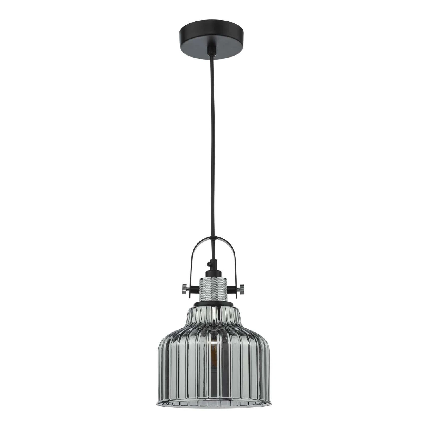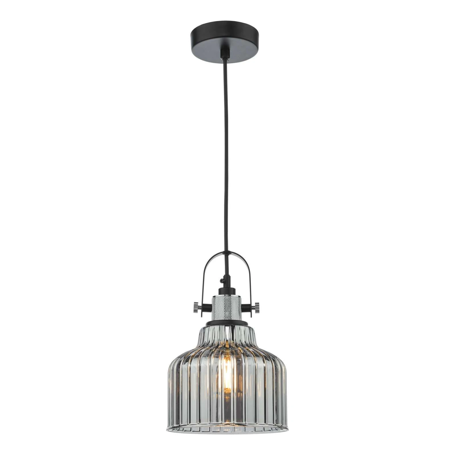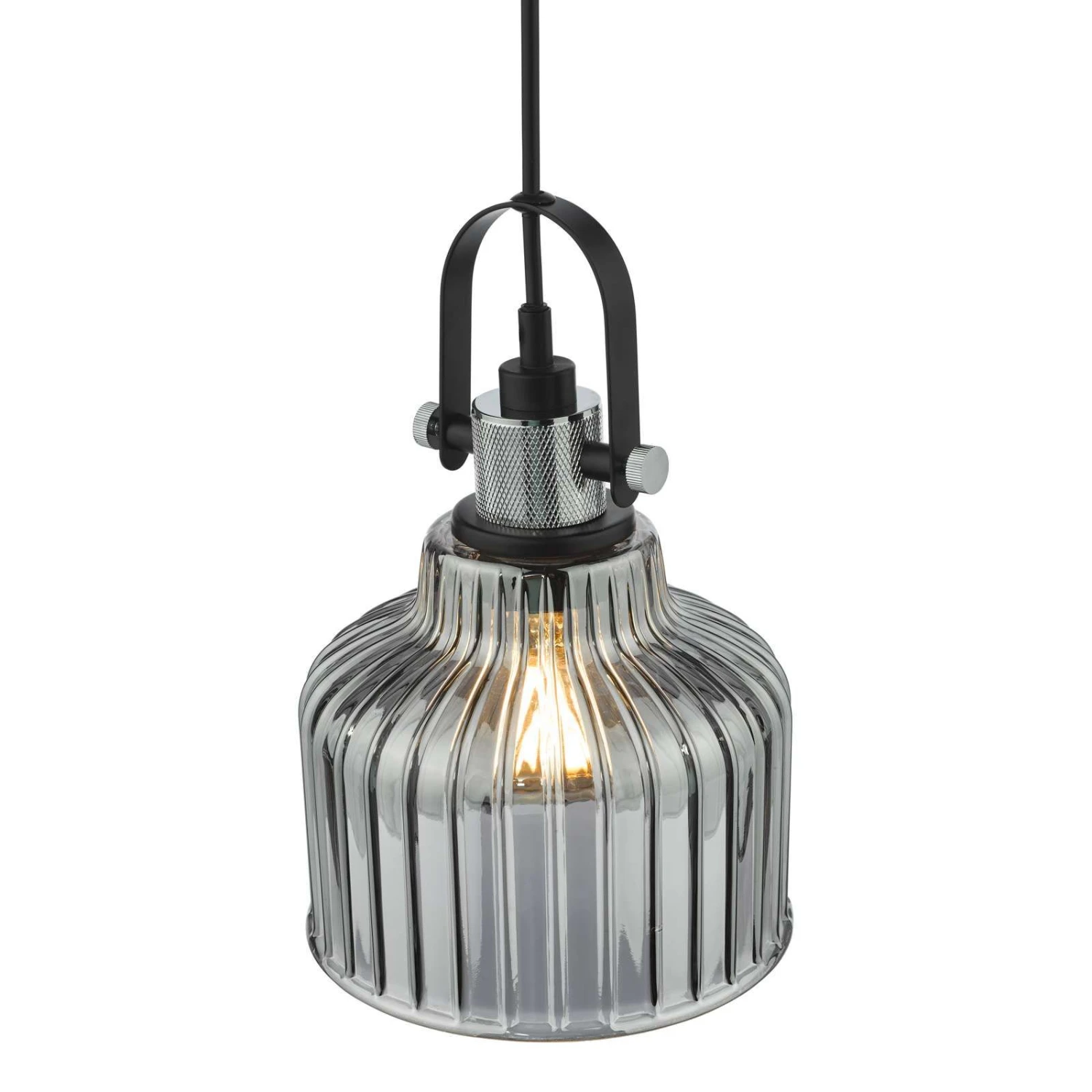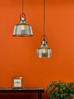The Rhode single pendant is a contemporary take on the industrial pendant style. The plated glass gives a sharp mirror effect on a ribbed glass that gently diffusers the light. Complemented by a knurled aluminium lamp holder. The combination of high quality materials makes a more glamorous cross over look than the typical industrial pendants.