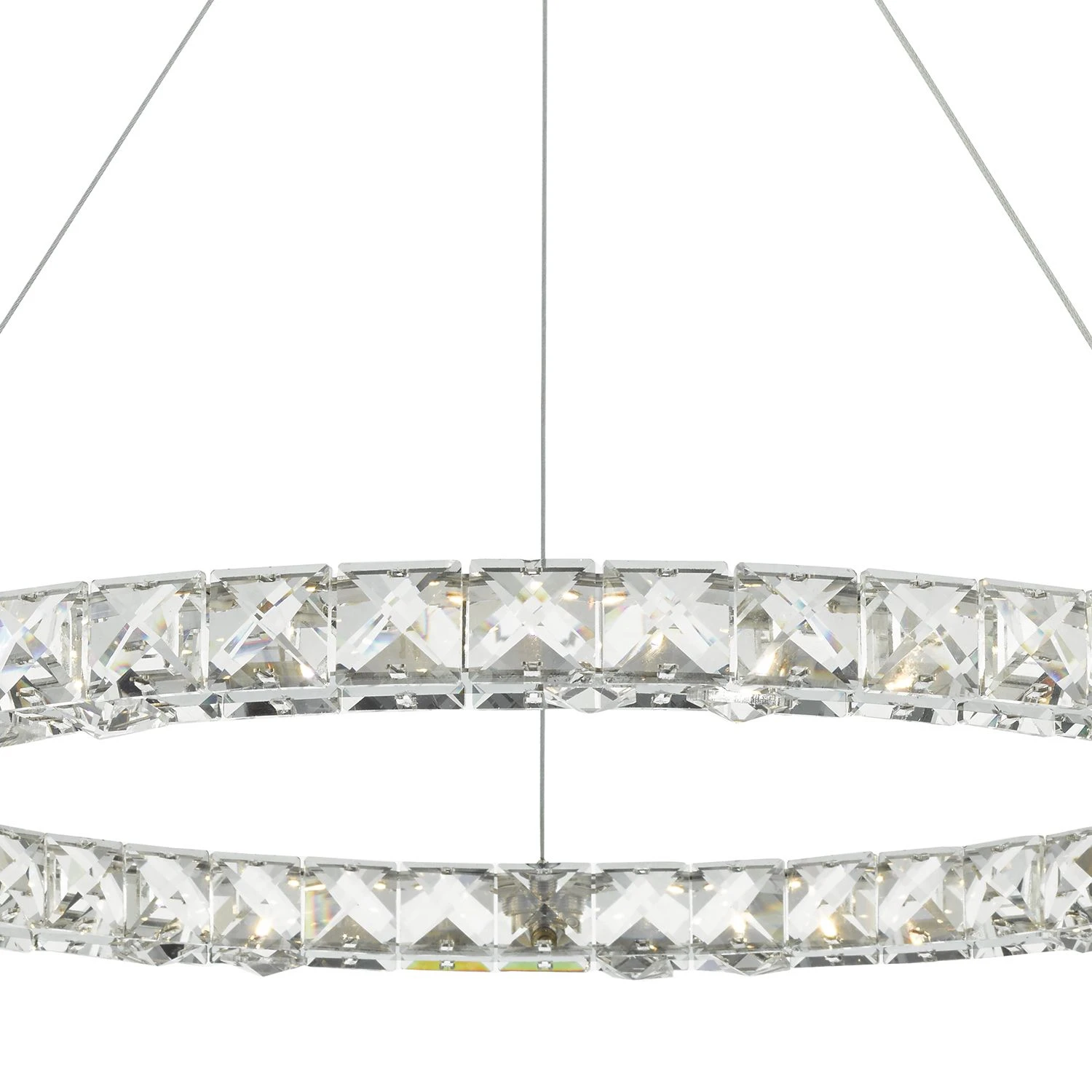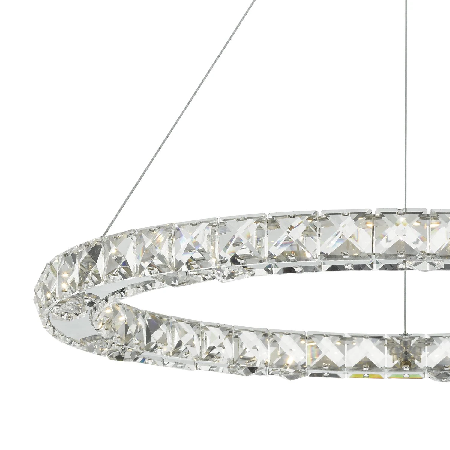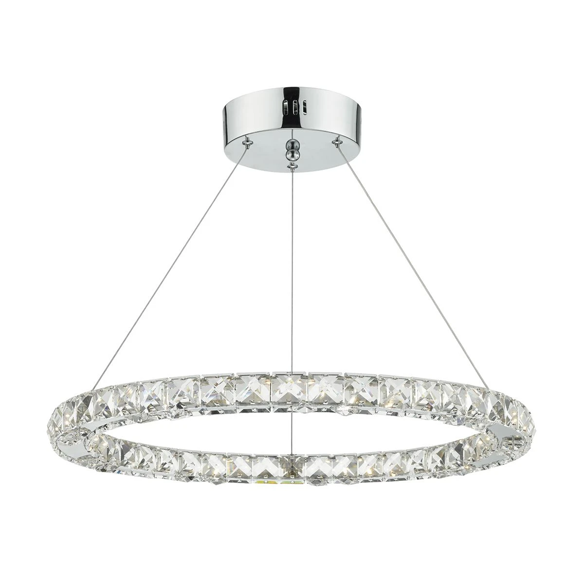 ROMA is a fabulous hoop of faceted crystal squares set in a polished chrome frame. Illuminated by modern LED technology this light fitting truly sparkles from all angles. It provides a great centre piece. The Roma can be used with a suitable dimmer to create a beautiful relaxed atmosphere.