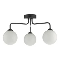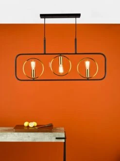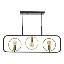 The Ryota 3 light bar pendant features 3 lamp holders framed with antique gold halos, all 3 sitting inside a large black frame suspended by 1 metre of black fabric cable that can be adjusted on installation. This linear pendant works great over a dining table or breakfast bar in the kitchen but can be hung low in the space to create a kind of lit pendant to separate open plan living room.