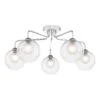The Seattle statement ceiling light references the path of comets through the night sky. With 8 pressed glass shades in clear sculptured glass with frosted inner detail, this semi flush ceiling light has four horizontal double-ended curved arms at slightly different heights attached mid-point to a wide cylindrical central stem. The frame is finished in a warm antique brass.