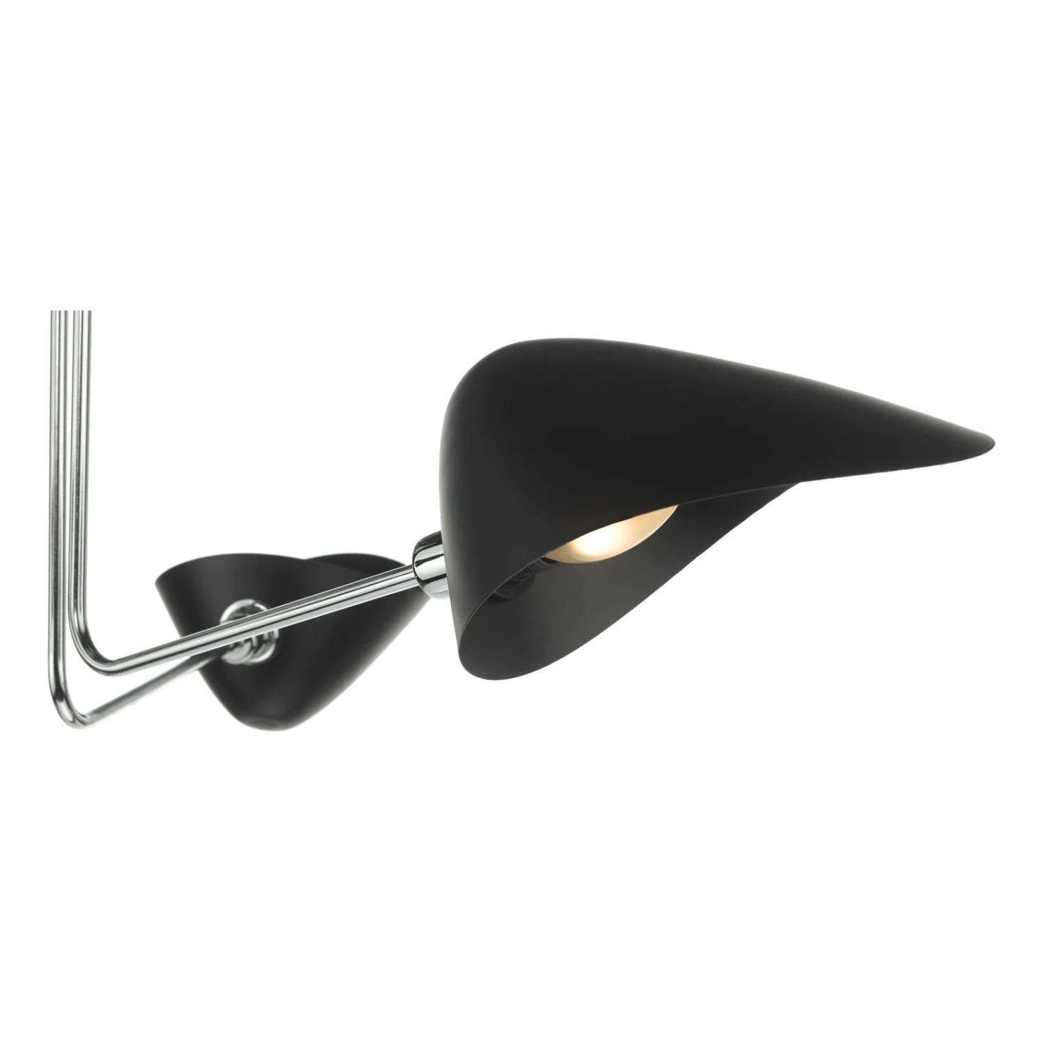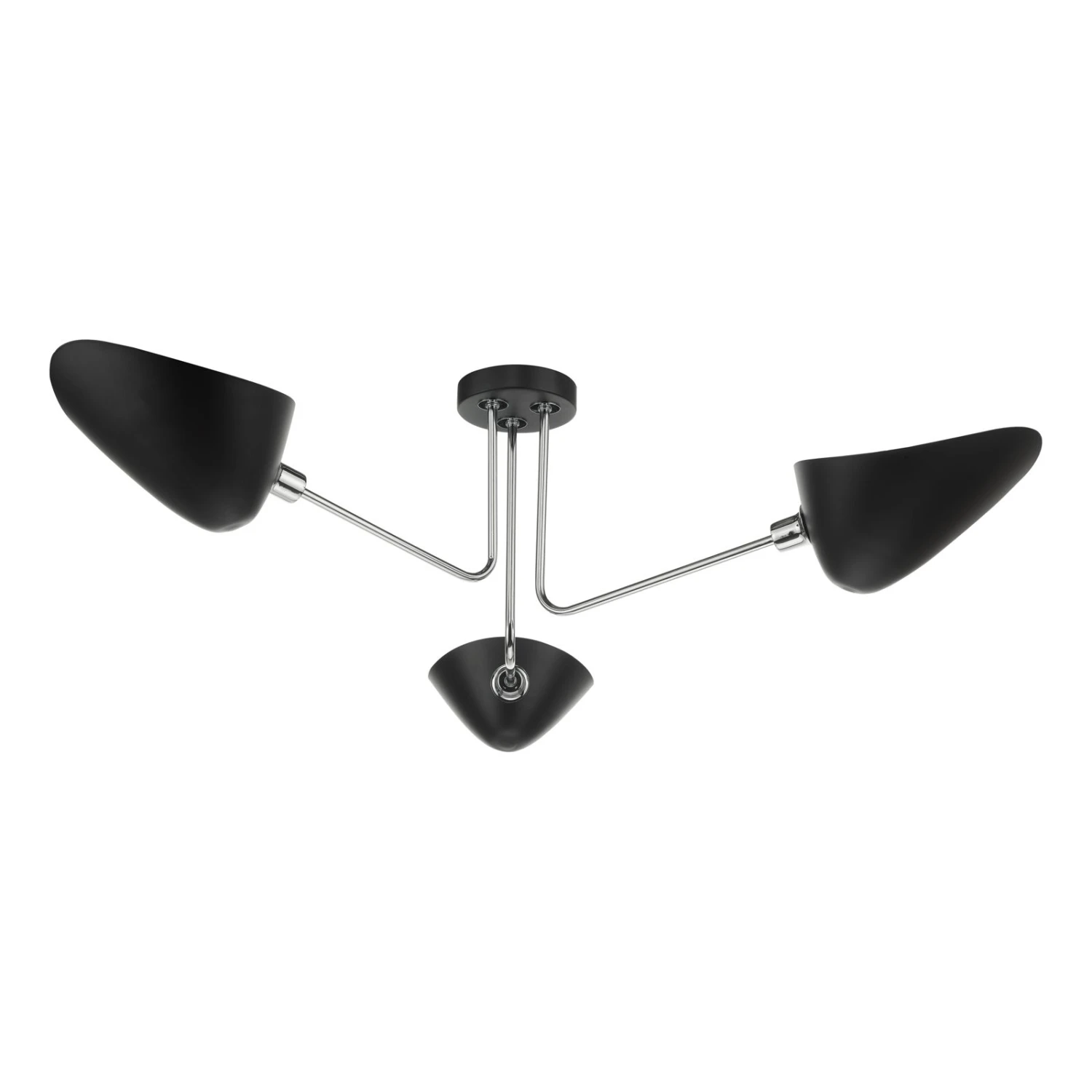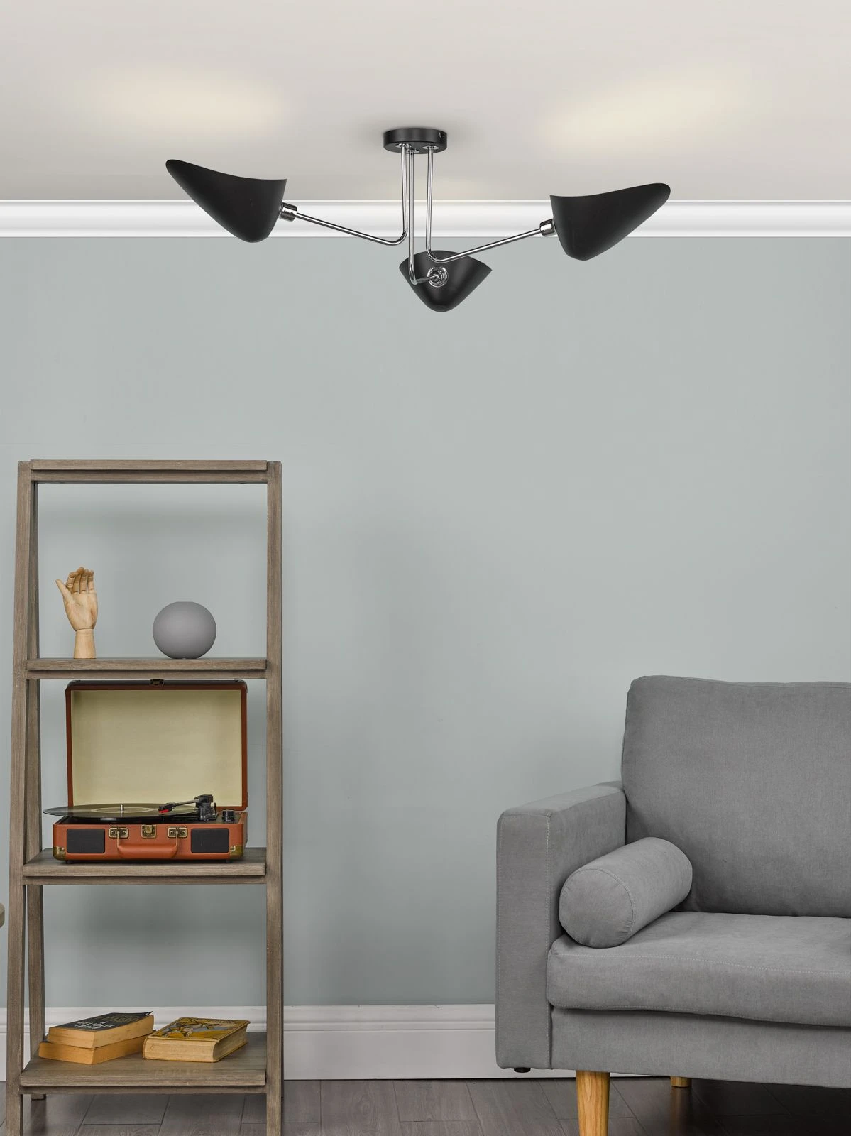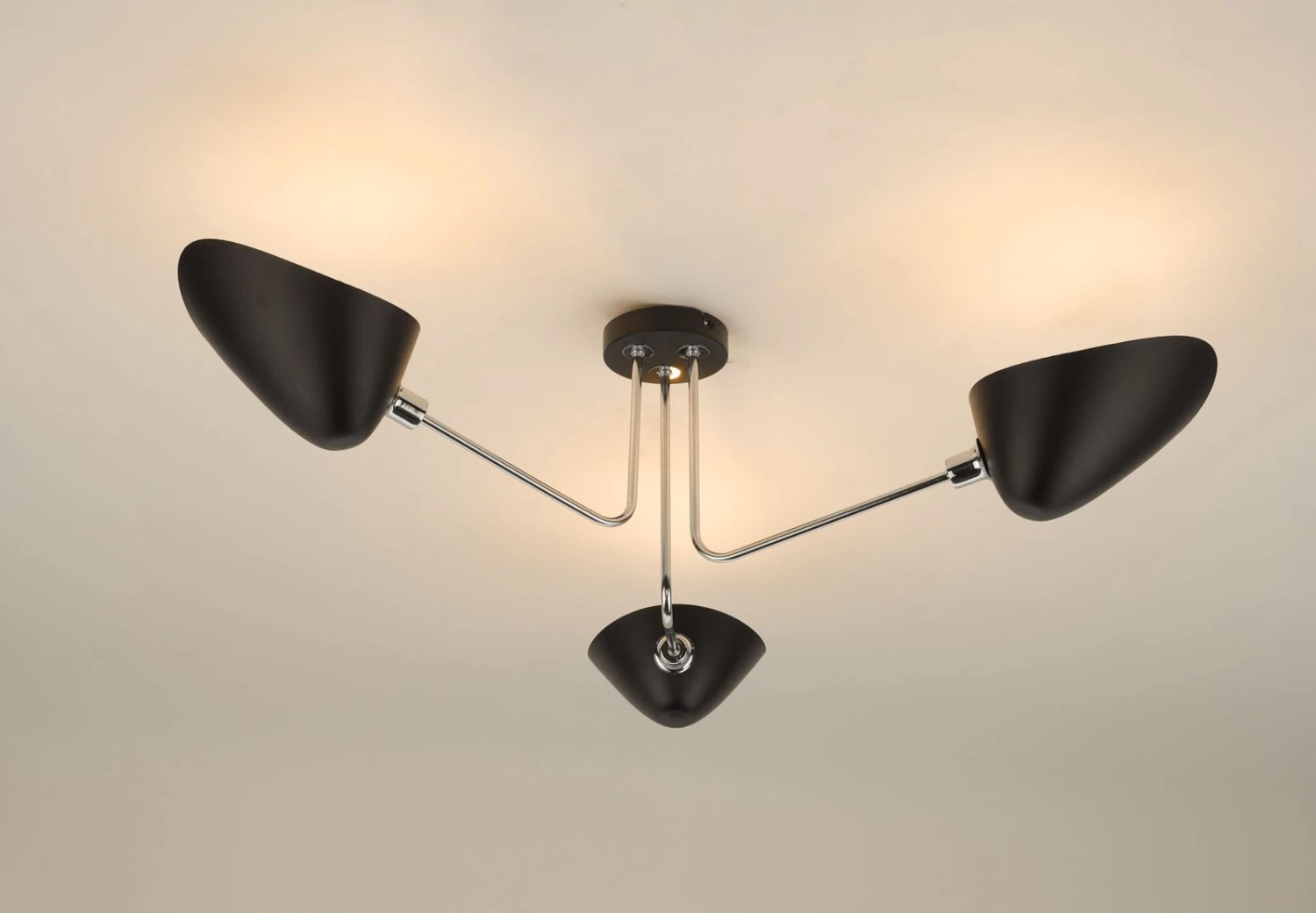The Sebastian 3 Light Semi Flush Ceiling Light in matt black and polished chrome. Designed for low ceiling this 50s inspired ceiling light features shell like shades which can be rotated to have a soft light reflected back from the ceiling or a stronger more direct light.
