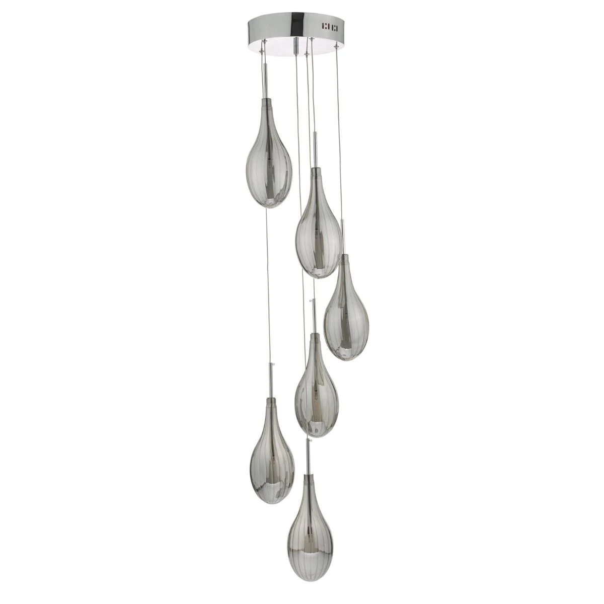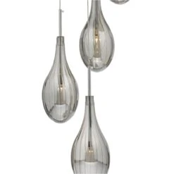 The Seta 6-light cluster pendant features droplet-style, ribbed smoked glass shades with a polished chrome ceiling cup.