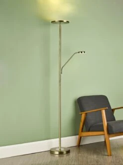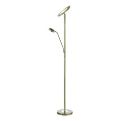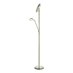 The Shelby LED Mother and Child is a wonderfully versatile floor lamp. Featuring a bright dimmable uplighter which can be angled to direct light against a wall or further into the room. An extra adjustable reading light is installed that can be controlled independently. Both light sources used highly efficient LED, which is also cool to the touch for ultimate safety. Finished in antique brass.