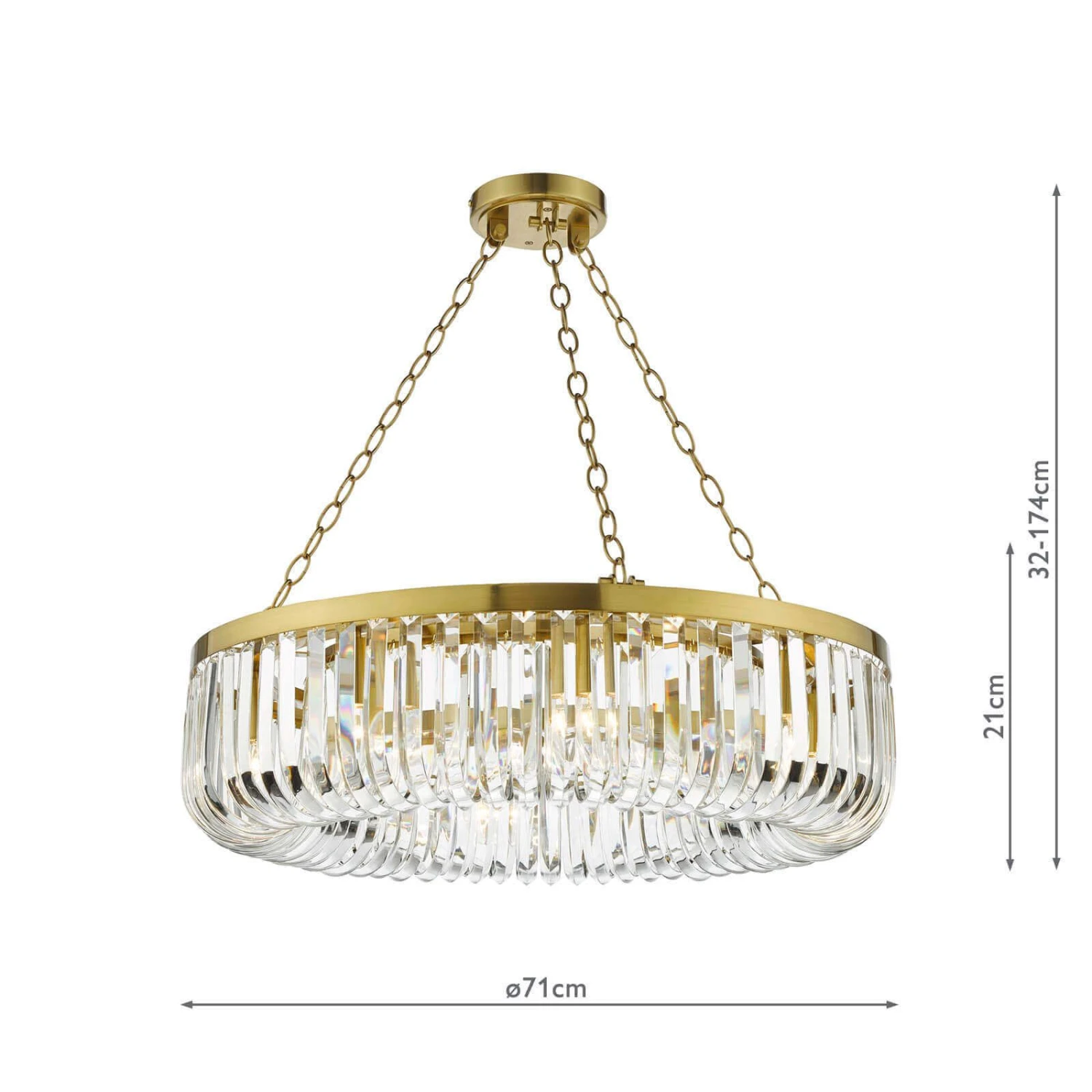 This stunning pendant accommodates eight E14 (SES) candle bulbs (not included), allowing you to customize the lighting to your preference. For optimal energy efficiency and a radiant glow, we recommend choosing LED candle bulbs from our range of LED bulbs. Illuminate your space with the Sigourney 8 Light Pendant Satin Gold and Crystal and let its beauty transform your home into a sanctuary of elegance and style.