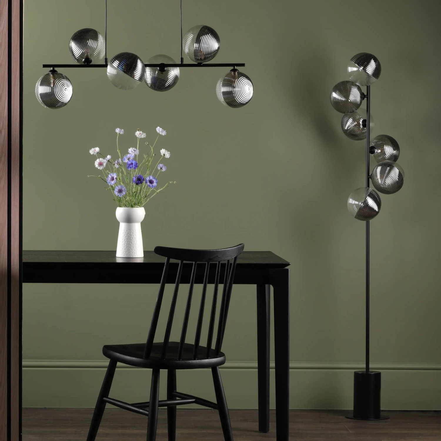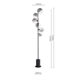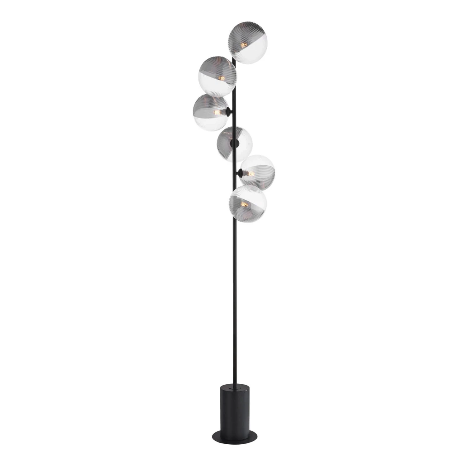 The Spiral 6 Light Matt Black Floor Lamp with Smoked and Clear Glass Shades features unique oversized asymmetric glass shades which are half smoked and half clear with opposing radial and linear ribbing. The result is a contemporary lighting fixture with an eye-catching yet understated look. The Spiral floor lamp features a black cable with a foot-activated switch, allowing easy operation of the light. Whether used in a reading nook or along a hallway, the Spiral floor lamp adds a touch of modern style to your space.