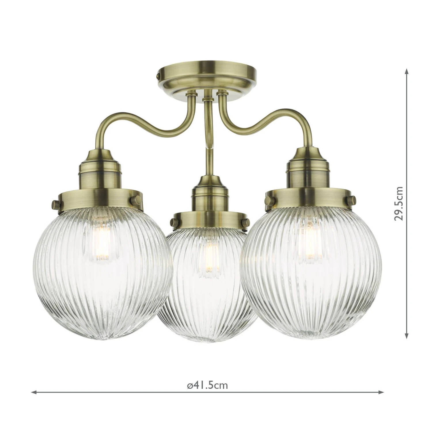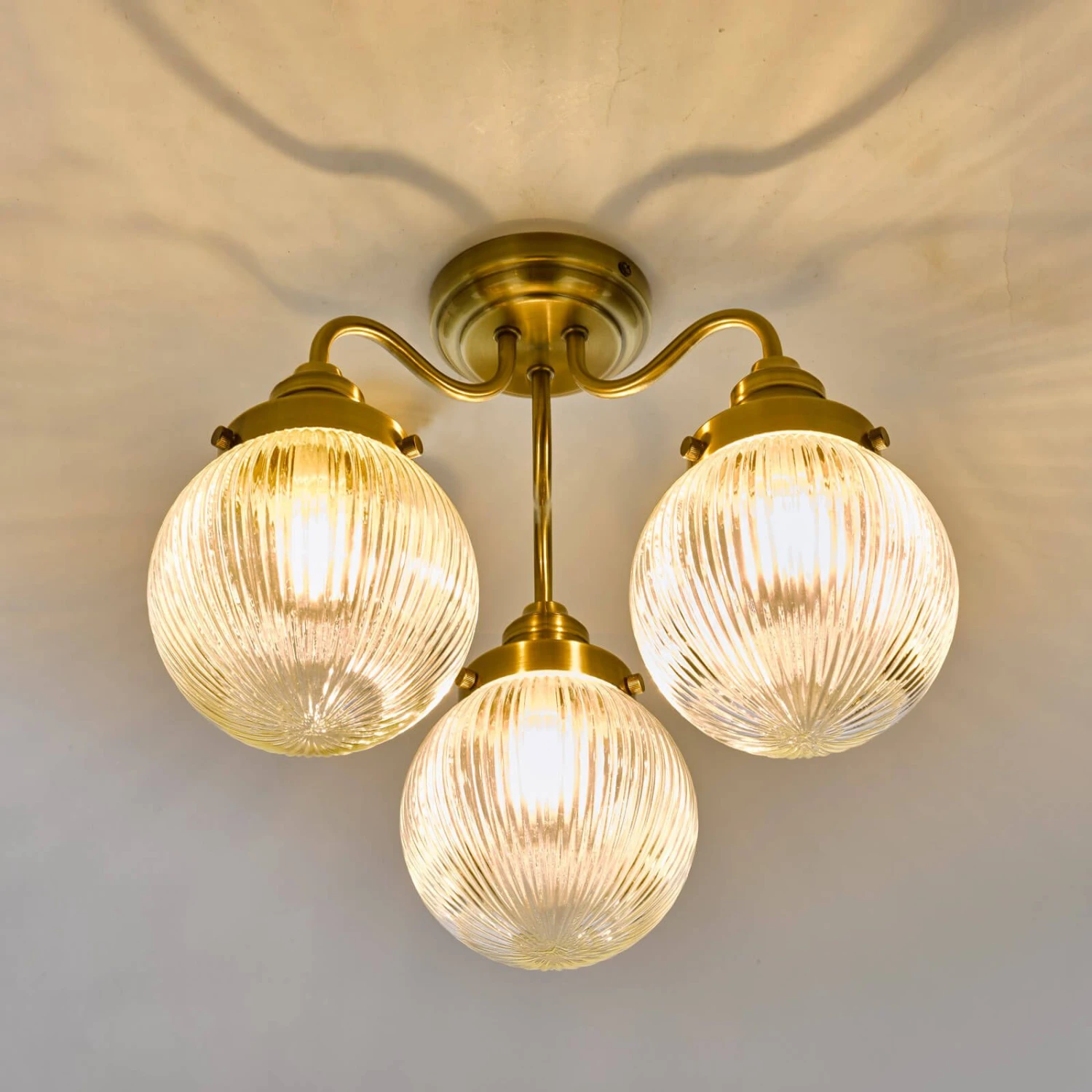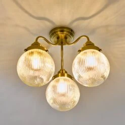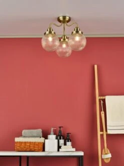 The Tamara 3 light bathroom ceiling light features three elegant ribbed glass shades, which would be equally at home in a French bistro or a country kitchen.