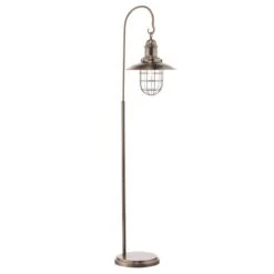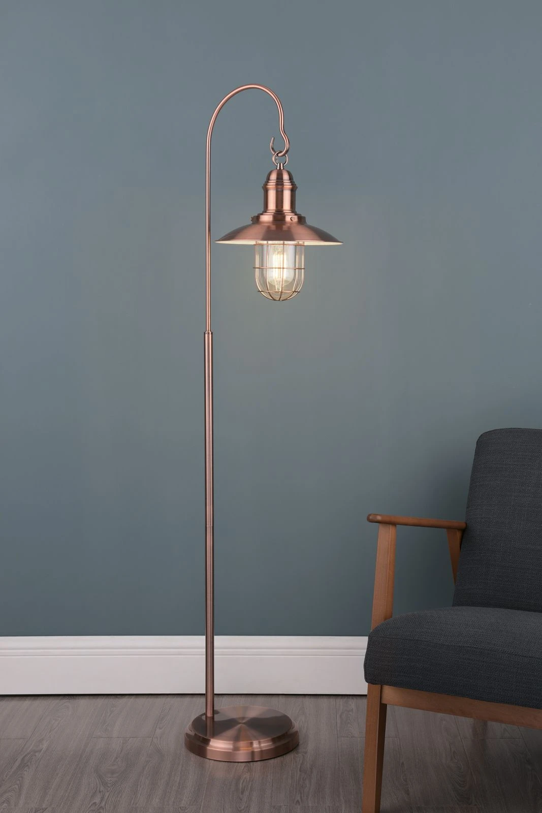 The 1lt Floor Lamp boasts a copper frame and caged, clear glass shade.