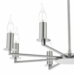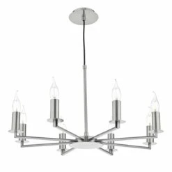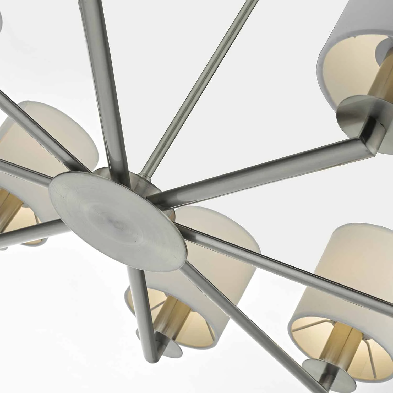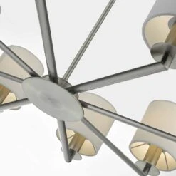 The TYLER eight-light pendant is a timeless classic design with arms extending out from a central circular base in a satin nickel finish. Height adjustable at point of installation. Supplied as fitting only; shown with shades S066 (sold separately).