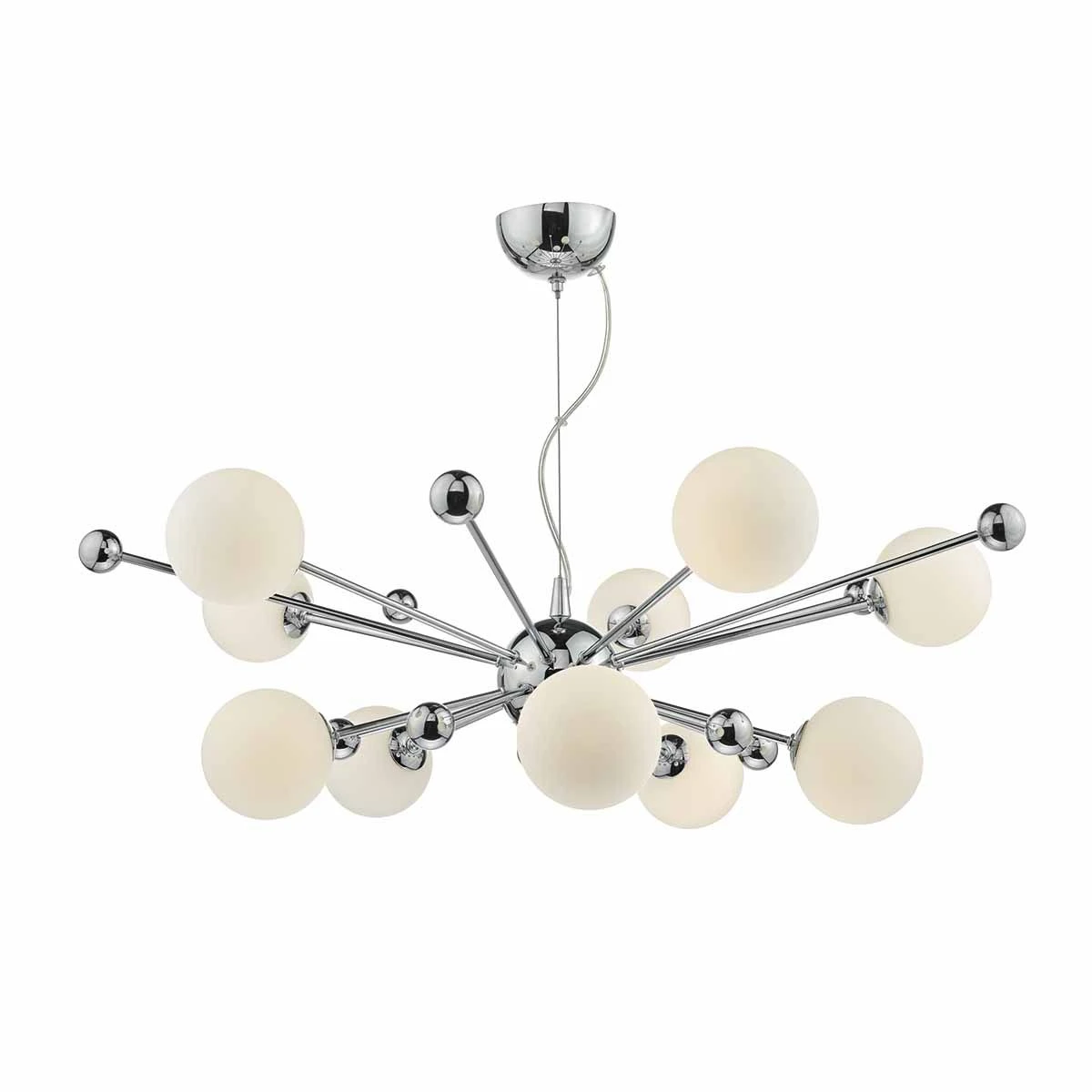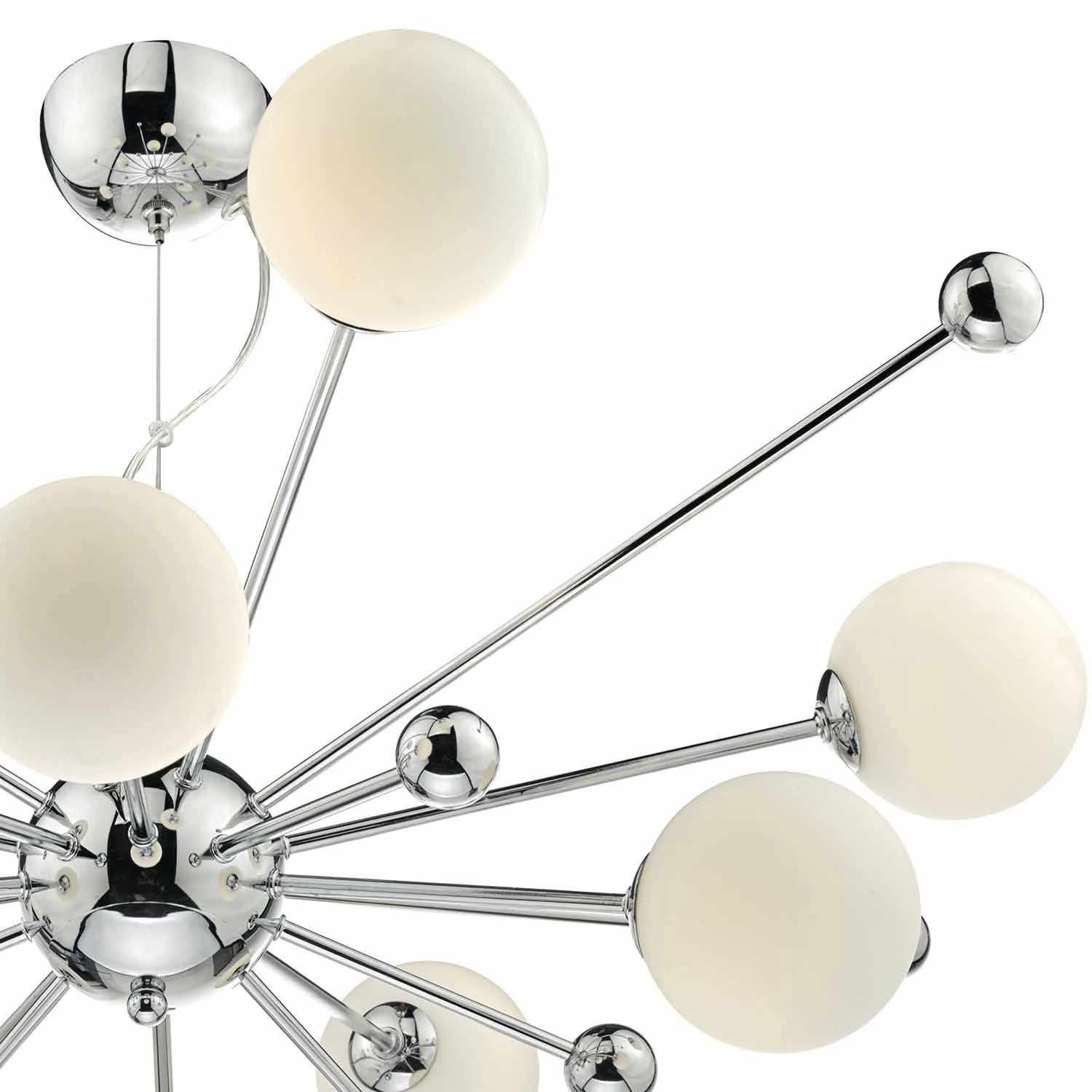 The URSA ten-light pendant is an stunning oversized pendant with large opal white glass globes shown mounted on a polished chrome frame suspended from a steel cable. Height adjustable at point of installation.