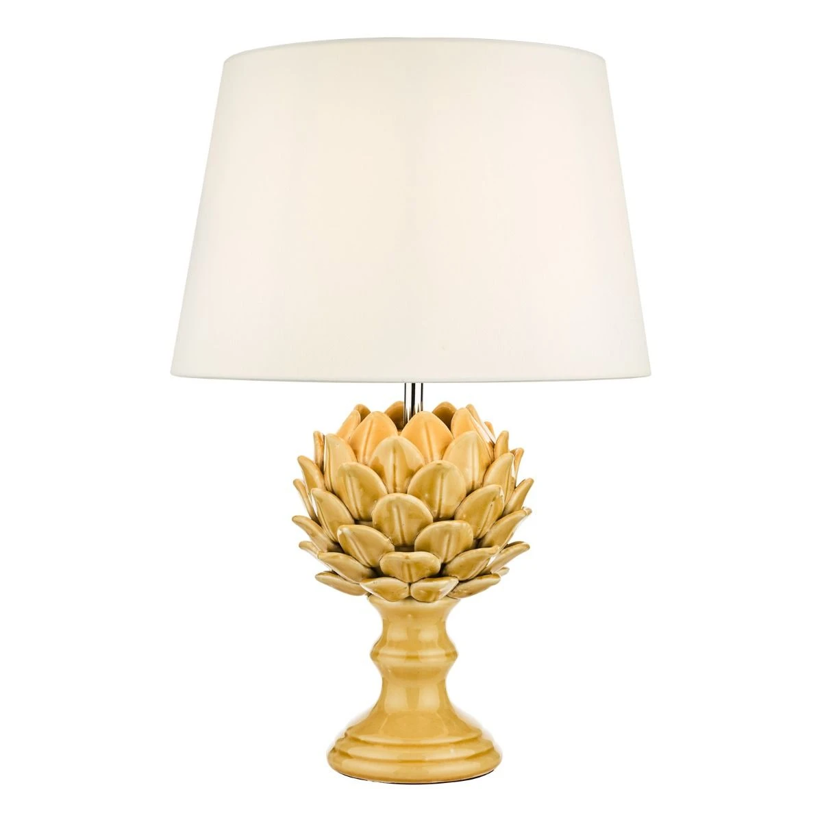The beautiful Violetta Table Lamp is a hand-crafted statuesque table lamp in distressed ceramic finished in antique cream with a popular artichoke motif, finished in an eye-catching mustard yellow glaze.
