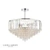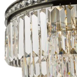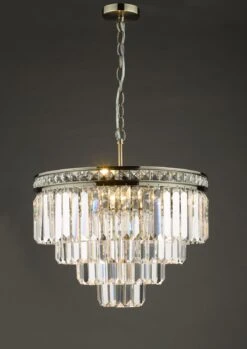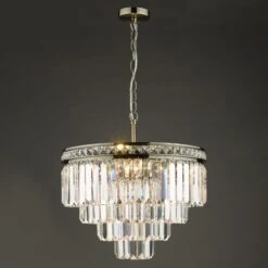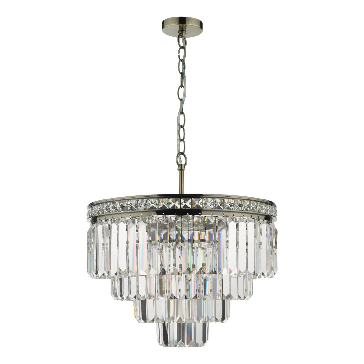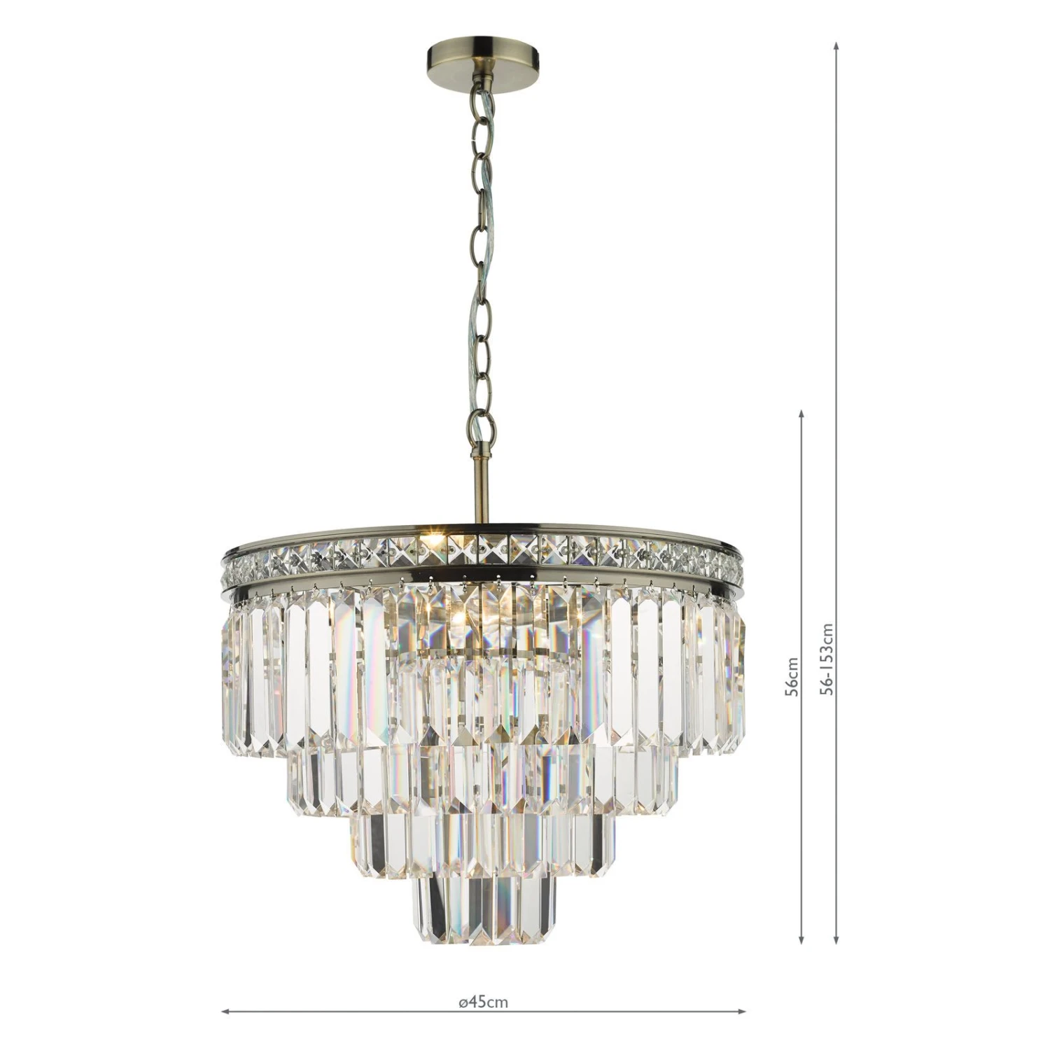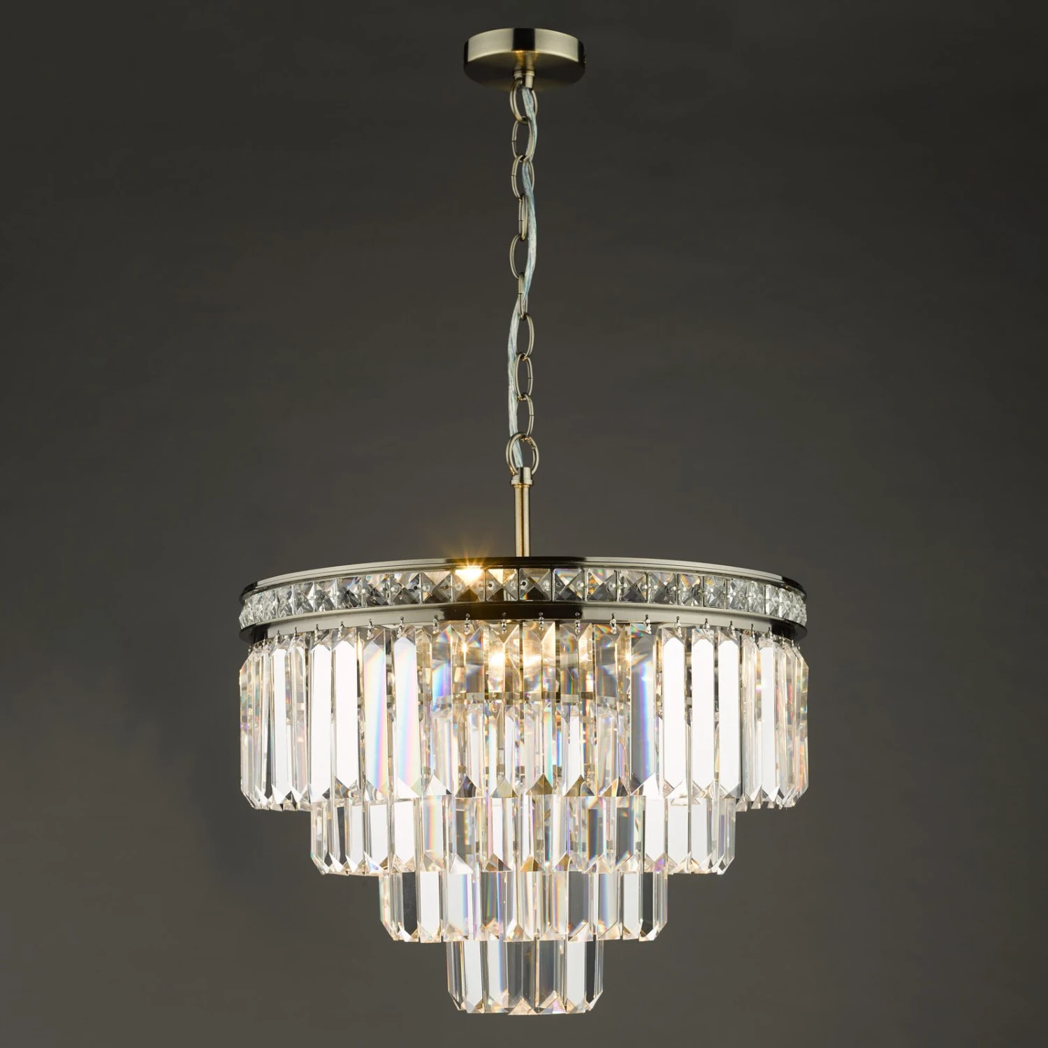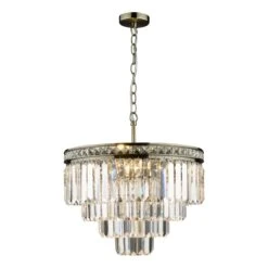 The Vyana is a classic crystal pendant in warm antique brass with faceted crystal squares decorating the frame from which cascade 4 luxury layers of heavy cascading crystal droppers cut in a prism shape. With its high fall, the Vyana statement ceiling light is ideal for use with high ceilings or over tables.