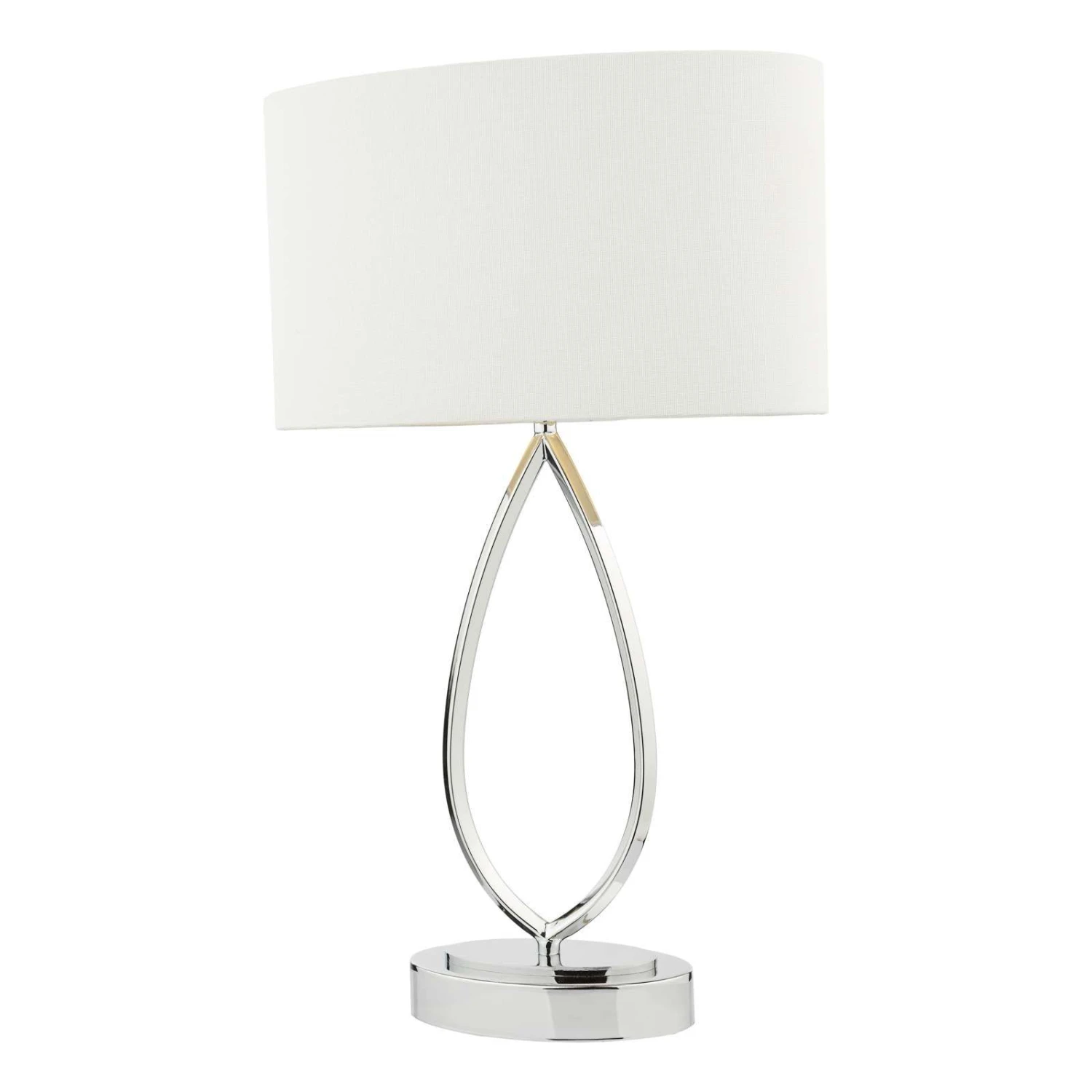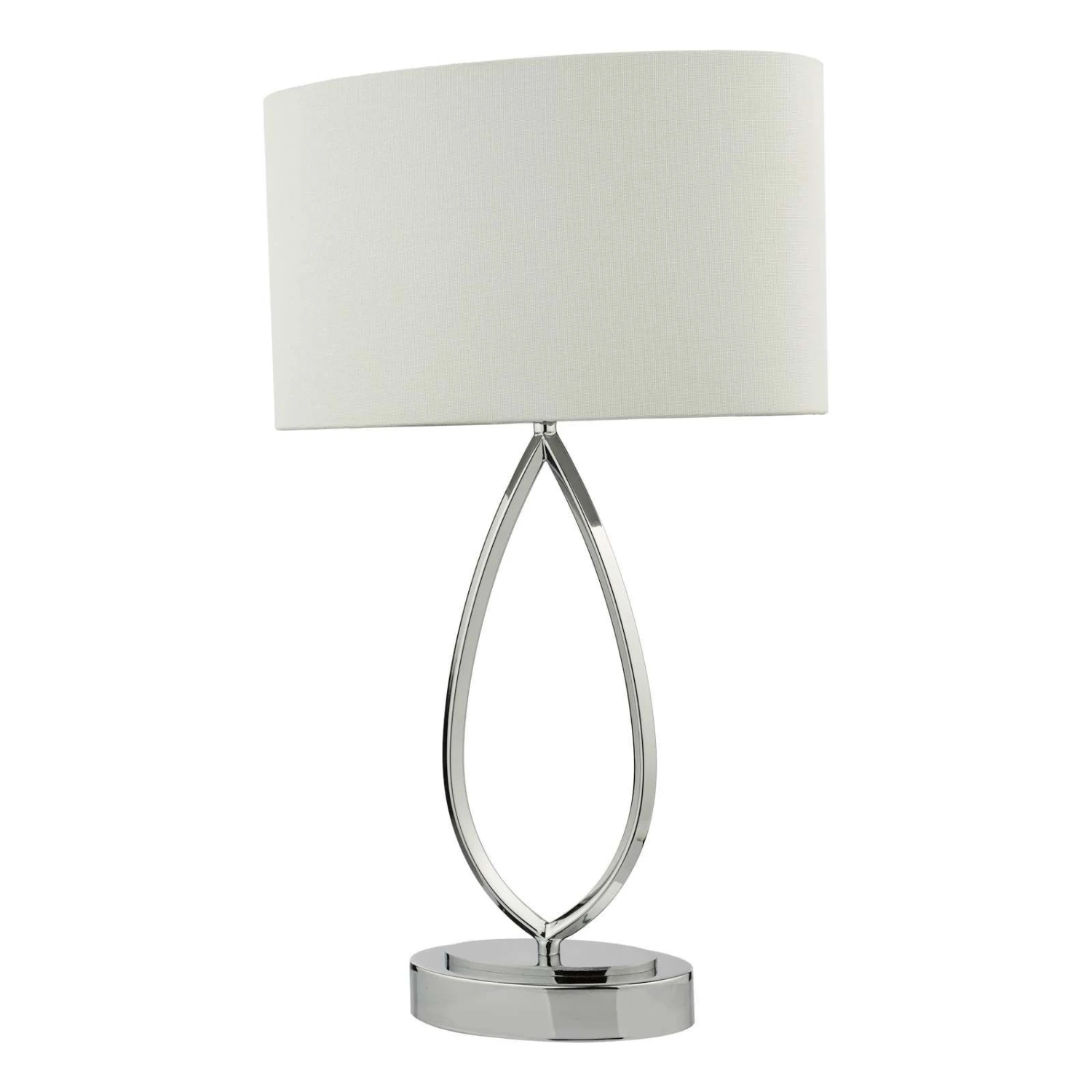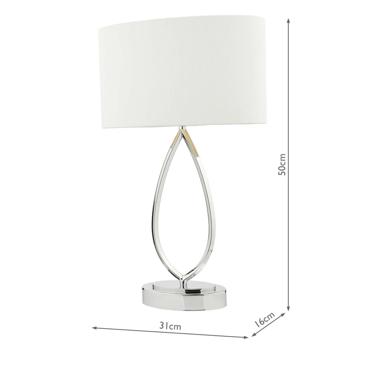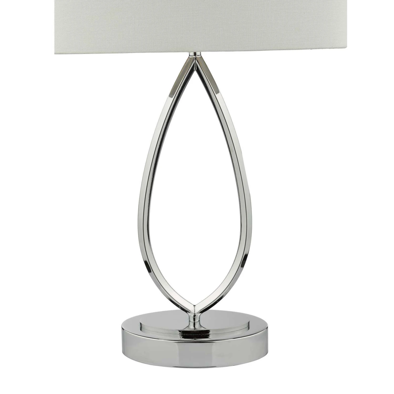 The Wyatt touch table lamp in polished chrome, is a tall lamp with an elegant teardrop shape outlined in diamond shaped metal work. Completed with an ivory linen and silver metallic lining.