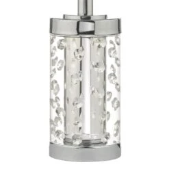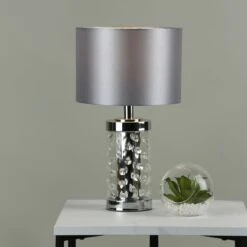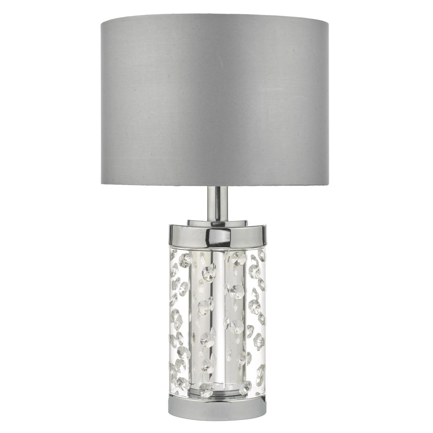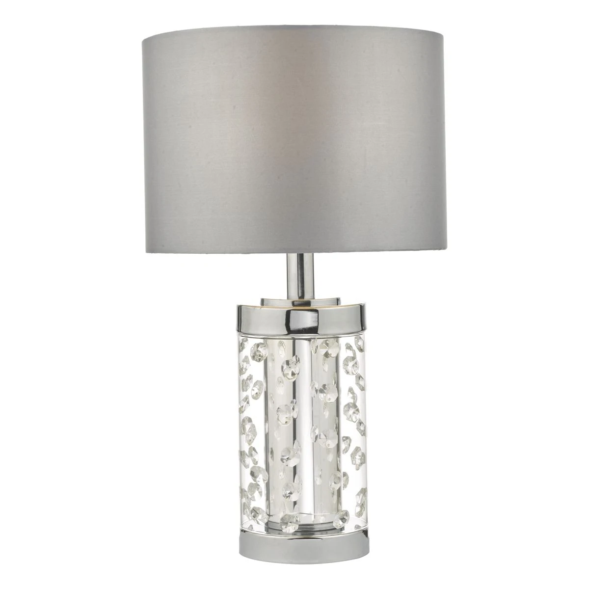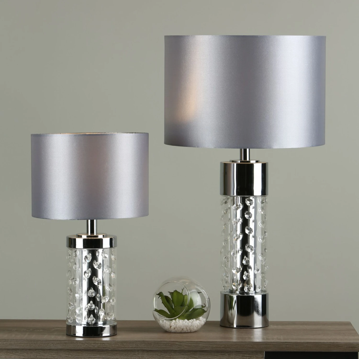 Yalena brings a striking opulence to interiors; featuring crystal glass beads within the glass base, complete with a grey faux silk shade.
