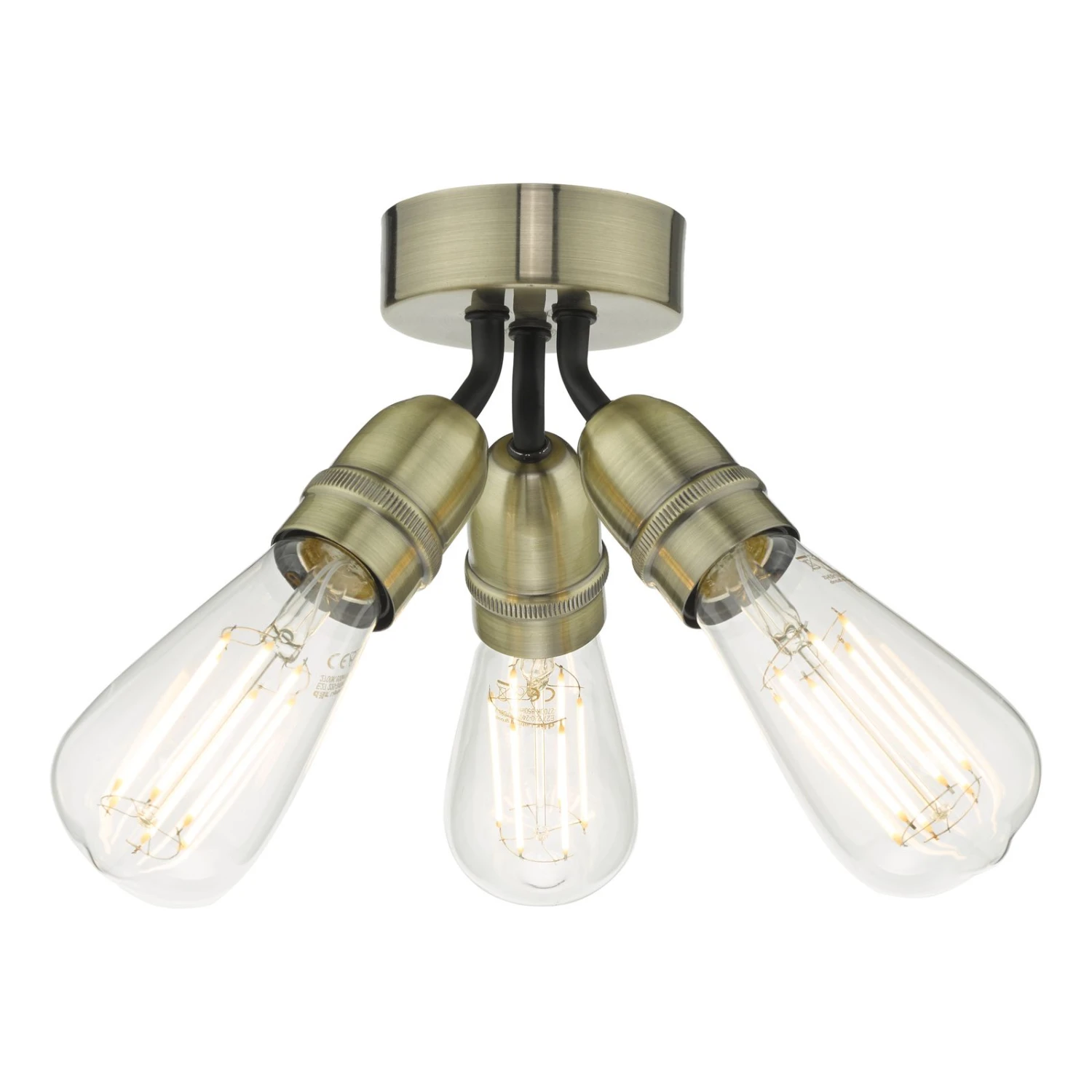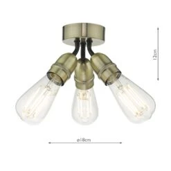 The YAO 3 Light Flush ceiling light is compact in size (diameter 18cm) but capable of providing a great light level from its 3 lamp heads. Finished in antique brass with authentic vintage detailing this ceiling fitting has a great deal of character and understated style. The arms are fixed giving an all round light out-put and as it sits close to the ceiling it is a great option for low ceilings or where space is limited.