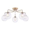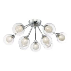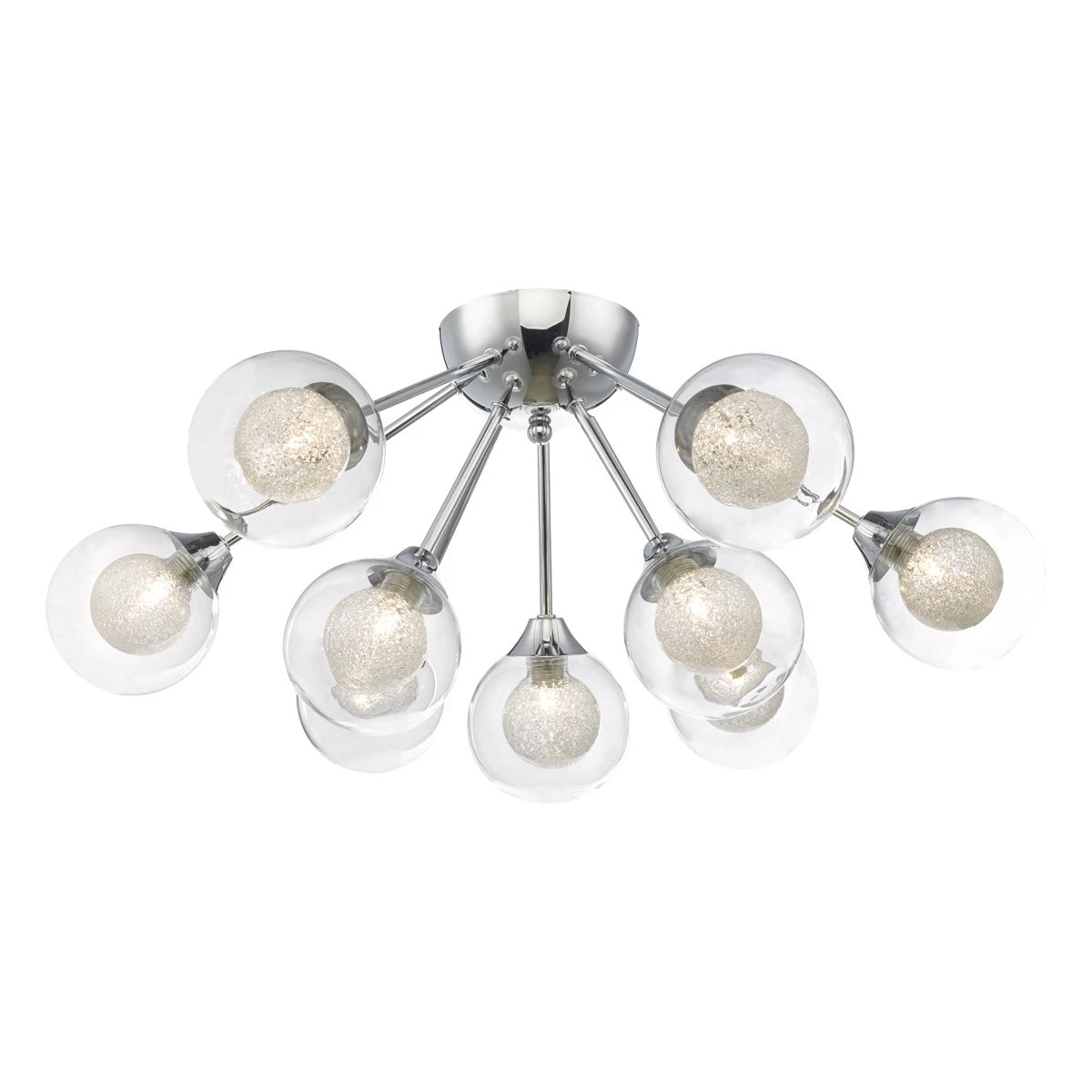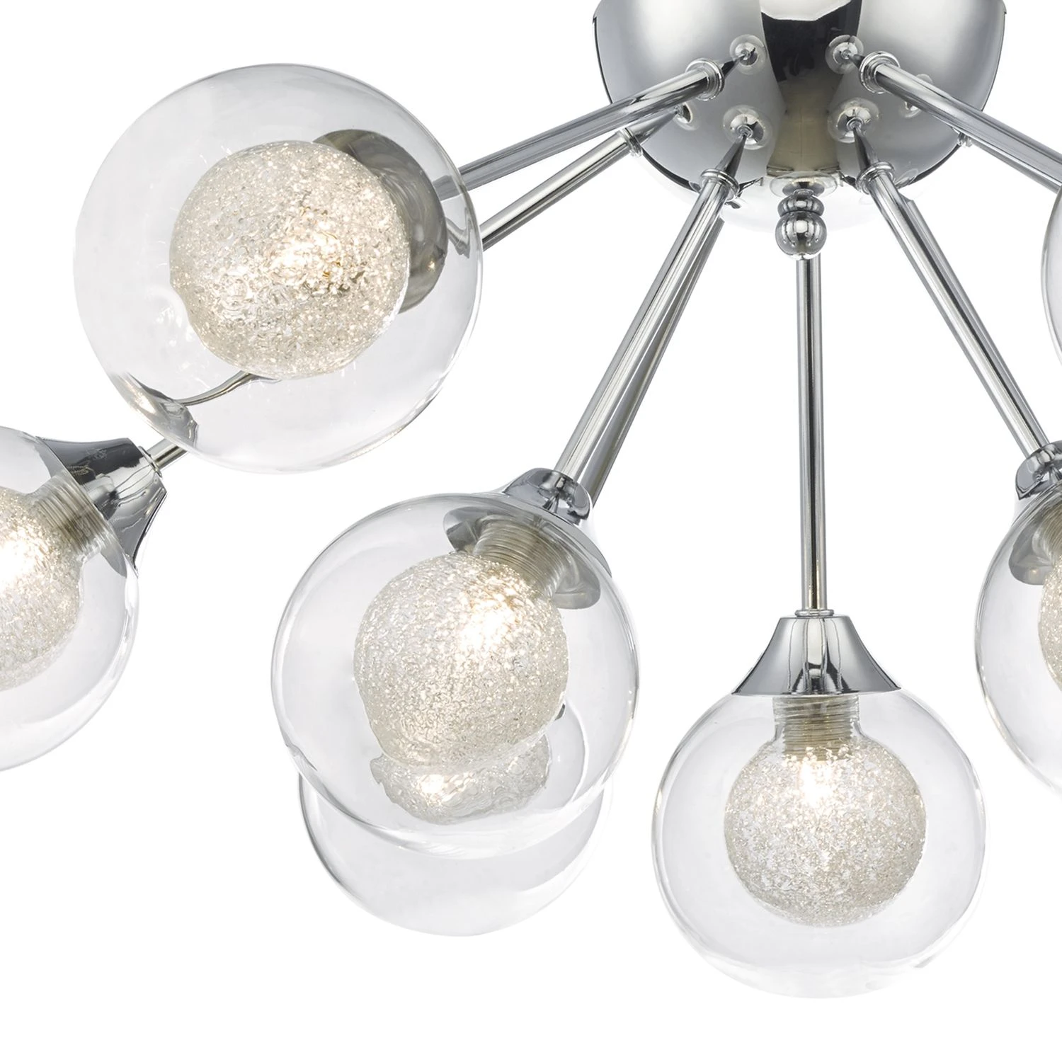 Glass orbs formed of two layers, a clear exterior globe and a sphere of sparkling spun glass at the centre. Available as a single wall light, an asymmetrical six-light semi-flush, and a large scale nine-light semi-flush.